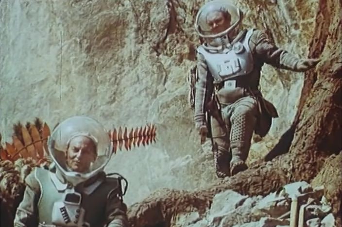 PLANET OF STORMS (1962), aka PLANETA BURG, is often cited as one of the finest Russian SF ‘rocketship’ films ever made. That may sound like a dubious distinction, but consider: the Soviets were at the time of this movie’s release at the very least ‘ahead’ in the ‘space race’ by a Sputnik’s length or so, arguably more. The fact their cinema was freed from total commercial restrictions (since the state sponsored all production and distribution costs, attendance costs were so nominal as to be free) but restricted by the need to propagandize communist state ideals (there’s lots of talk about the superiority of the red way, comrade!) makes for an interesting tension not unlike their American brethren of the era’s ceaselessly pro-American jingoism.