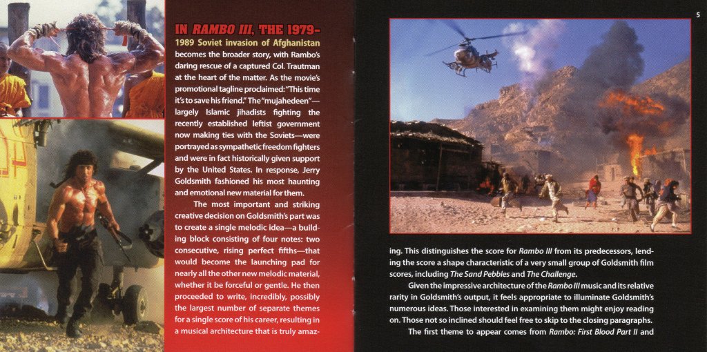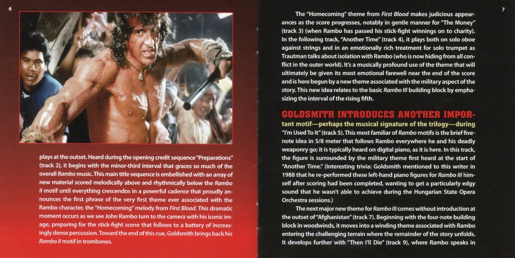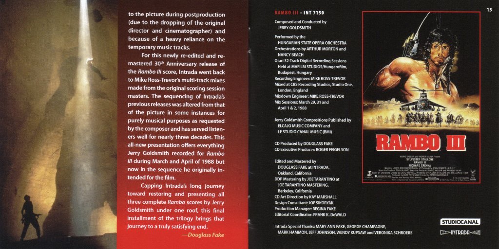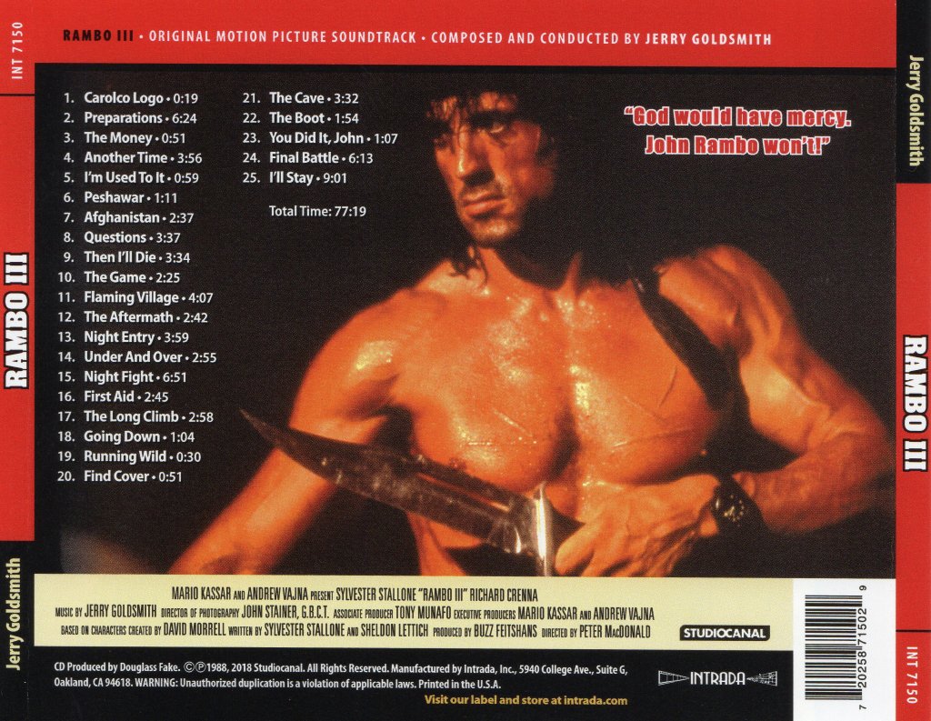 Rambo III re-sequenced, re-mastered, re-packaged! After lengthy delay, third and final score by Jerry Goldsmith in initial Rambo trilogy finally brings Intrada CD series under one roof at the same time. John Rambo takes on Russians in Afghanistan in effort to rescue captured Colonel Trainman. Sylvester Stallone, Richard Crenna star, John Stainier photographs, Stallone & Sheldon Lettich script, Buzz Feitshans produces, Peter MacDonald directs. Jerry Goldsmith writes his longest Rambo score, infuses it with the largest number of thematic ideas as well. Melodies from first two films do appear but this time Goldsmith emphasizes all-new Rambo-in-action material with new rhythmic foundations as well. Also of note: Architectural device of new four-note building block that launches new theme. Motif not only anchors new Rambo theme but also opens other new material including music for Afghanistan locale plus beautiful minor-key theme underlining Rambo’s loyalty to new friends helping him in his cause. Capturing center stage none-the-less is dynamic action music wherein four-note motif in brass over familiar mixed-meter rhythms in left-hand digital piano literally propel Rambo into action. Goldsmith himself dubbed forte performance of piano overlays during mixing to create unusually commanding timbre. Post-production editing of the film created necessity to truncate numerous cues, replace others with tracks from second film. As such, CD for Rambo III features music not heard in final film. Highlights of score are numerous but standing tall is powerful ending sequence when Rambo parts with new friends, rides off in Jeep with Trautman. Here, Goldsmith returns to his very first “Homecoming” theme from movie that launched series, First Blood. As solo trumpet gives way to strings, entire orchestra crescendoes in powerful fortissimo farewell to this most emotional of Goldsmith themes. Entire following end credit music heard in same cue (“I’ll Stay”) offers magnificent medley of new action theme with haunting minor-key theme, culminating in stirring coda that melds both second and third film’s themes in single muscular flourish. Great finale to the trilogy! Intrada presents entire score from first generation three-track masters mixed by Mike Ross-Trevor from his original Otari 32-track digital scoring session elements. Previous releases were produced from two-track session DATs. New mastering adds weight, clarity. Score also now presented for the first time in film sequence. New liner notes focusing on thematic ideas plus revised packaging from Kay Marshall complete this definitive look at a genuine Goldsmith action classic! “The first time was for himself. The second was for his country. This time is for his friend.” Arthur Morton, Nancy Beach orchestrate, Jerry Goldsmith composes, conducts Hungarian State Opera Orchestra.