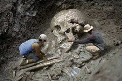 But, yes, this is a photoshopped image. The original image of the skeleton is that of one found by archaeologist David Billoin in Echenoz-le-Meline, France, on June 11, 2008, as part of a Merovingian necropolis that dates to the 6th century after Christ. As you can see in the images below, from the Getty Images website, the head shot is undoubtedly the one used for the image above… and the longer distance shot of the full body makes it clear it is not the scale of a giant.