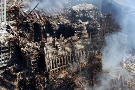 According to the official explanation of the collapse of the Twin Towers on Sept. 11th, 2001… the initial plane crashes damaged the core structure of the towers enough so that when the resulting fires “weakened” the floor trusses, the result was that the remaining floors above the areas of the plane crash and fires crashed down on the undamaged parts of the buildings, and “pulverized” them in a gravity driven demolition of sorts.