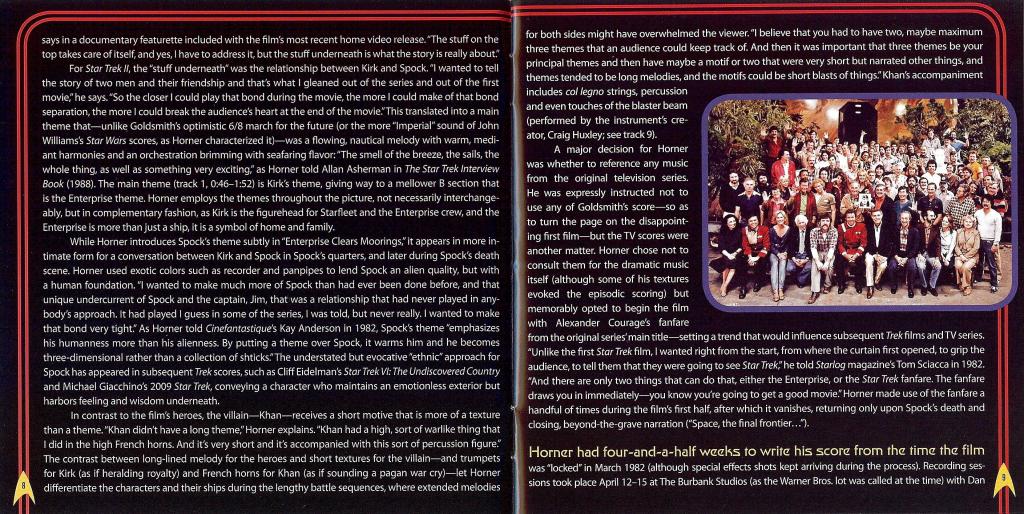 Two of the more exciting offerings are the music from the scene where Spock sacrifices himself for the crew (“Spock (dies)”) and the amazing battle music of “Enterprise Attacks Reliant.” The expanded edition also includes the one selection not composed by Horner. The music for “The Genesis Project” was actually composed by Craig Huxley. Astute fans may remember that Huxley, now a Grammy and Emmy award winning musician, played Peter Kirk (nephew to Captain Kirk in “Operation Annihilate!”) and Tommy Starnes (“And the Children Shall Lead”). He is also the inventor of the “blaster beam” instrument which was the voice of V’Ger in Jerry Goldsmith’s music for Star Trek: The Motion Picture. There are also bonus tracks, including “Amazing Grace” and the original epilogue and end credits music. As many fans know, the scene with Spock’s photon casing on Genesis was added to the film after completion. This necessitated new music and reediting of the film. The TWOK bonus track includes the version of the music as it originally would have played if this scene was not added to the feature film.
