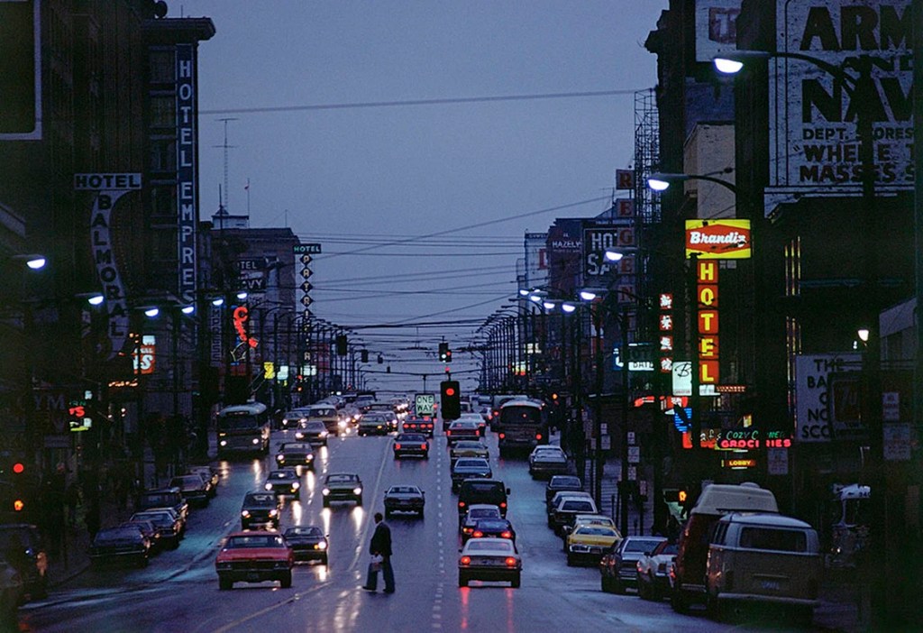 Just behind this Camaro is the back of the Hotel Vancouver. Girard captured a seemingly desolate scene where a Camaro with a flat tire could sit seemingly forgotten in a downtown alley. Go to that alley now and it’s at the centre of one of Canada’s most high-traffic areas: With high end shopping, gourmet restaurants and towering glass condos on all sides. This was also snapped only a few month before the Vancouver Canucks would first advance to the Stanley Cup finals — marking the last time that the Canucks would make the Stanley Cup finals without sparking a devastating riot.