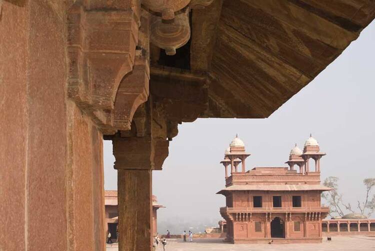 The inscribed property covers 60.735 ha, with a buffer zone of 475.542 ha. The city, which is bounded on three sides by a wall 6 km long fortified by towers and pierced by nine gates, includes a number of impressive edifices of secular and religious nature that exhibit a fusion of prolific and versatile Indo-Islamic styles. The city was originally rectangular in plan, with a grid pattern of roads and by-lanes which cut at right angles, and featured an efficient drainage and water management system. The well-defined administrative block, royal palaces, and Jama Masjid are located in the centre of the city. The buildings are constructed in red sandstone with little use of marble. Diwan-i-Am (Hall of Public Audience) is encircled by a series of porticos broken up at the west by the insertion of the emperor’s seat in the form of a small raised chamber separated by perforated stone screens and provided with pitched stone roof. This chamber communicates directly with the imperial palace complex clustered along a vast court. At the north side of it stands a building popularly known as Diwan-i-Khas (Hall of Private Audience), also known as the ‘Jewel House’. Other monuments of exceptional quality are Panch Mahal, an extraordinary, entirely columnar five-storey structure disposed asymmetrically on the pattern of a Persian badgir, or wind-catcher tower; the pavilion of Turkish Sultana; Anup Talao (Peerless Pool); Diwan-Khana-i-Khas and Khwabgah (Sleeping Chamber); palace of Jodha Bai, the largest building of the residential complex, which has richly carved interior pillars, balconies, perforated stone windows, and an azure-blue ribbed roof on the north and south sides; Birbal’s House; and the Caravan Sarai, Haram Sara, baths, water works, stables and Hiran tower. Architecturally, the buildings are a beautiful amalgamation of indigenous and Persian styles.