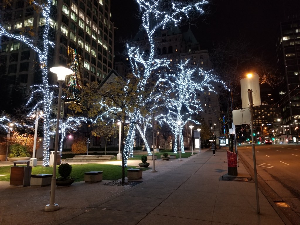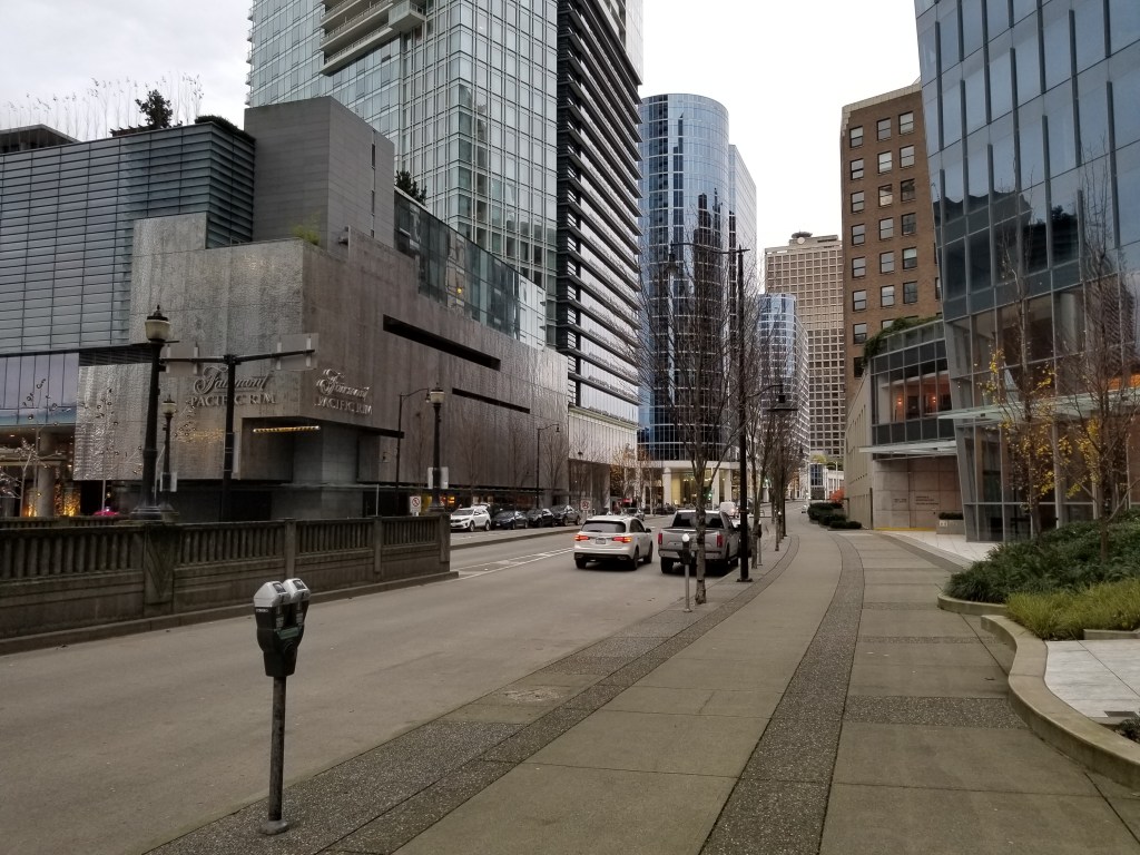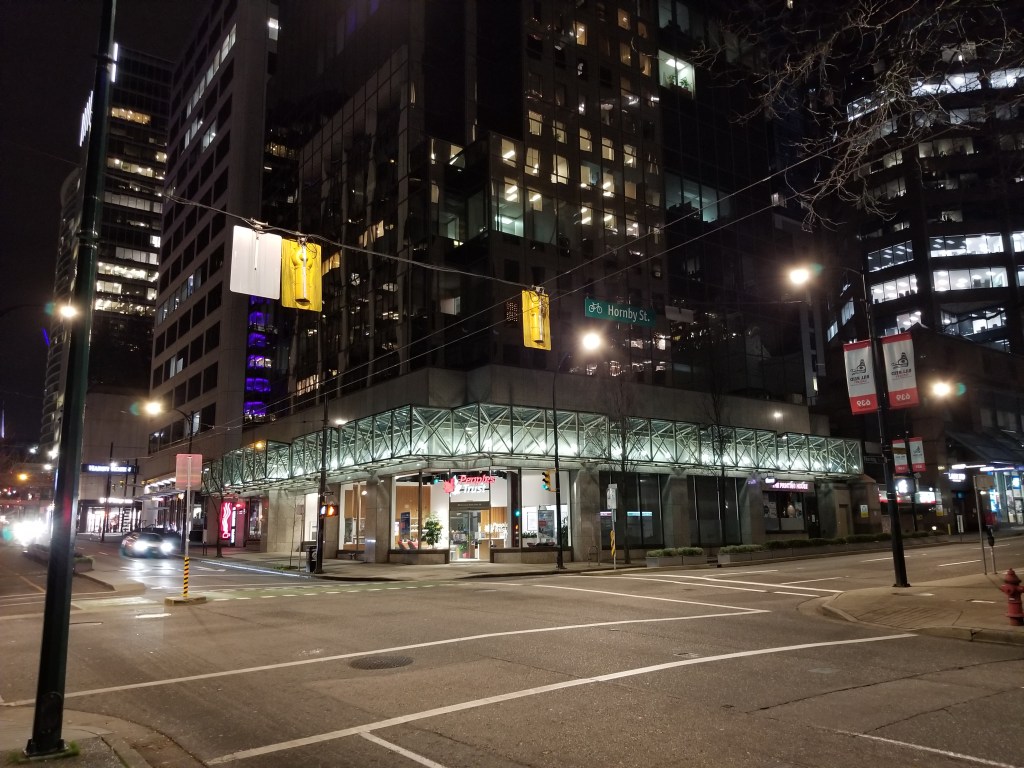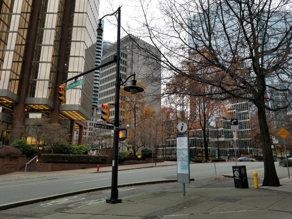 When originally opened, the station’s only underground passage was to the Bentall Centre skyscraper complex. A connection to the Royal Centre complex was constructed some years later, while an anticipated underground passage to the Park Place skyscraper across the street was never built. The construction of a new east entrance to the station, at the southeast corner of the intersection of Burrard and Dunsmuir, was considered as part of upgrades to the station included in TransLink’s 10-Year Vision, but the cost of such an addition was higher than expected and TransLink turned to reviewing options to improve the existing entrance.