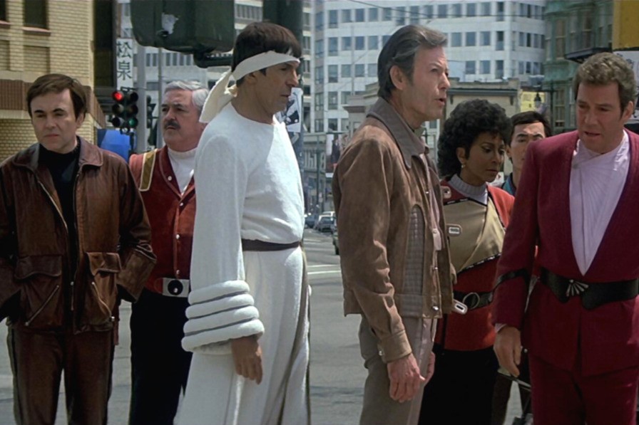 Anyway, The Voyage Home: after the events of Star Trek III: The Search for Spock, the crew of the late U.S.S. Enterprise merely waits on the rehabilitation of the resurrected Spock (Leonard Nimoy) to head back to Earth and face trial for their acts of insubordination and sabotage; but as they idly cool their heels on Vulcan, Earth is under a strange kind of attack from a strange alien probe, a huge black cylinder with a small blue protuberance uttering an otherworldly noise and blanking out power in every station and ship it passes. Having set up shop above Earth’s atmosphere, the probe is now vaporising the oceans, turning the planet into a cloud-locked hell. As the Enterprise crew returns on their commandeered Klingon Bird of Prey, they’re able to determine that the probe’s message is in fact identical to the songs of humpback whales, and from there it’s easy to deduce that the probe is searching for a species that has been extinct for two hundred years. Obviously, then, the best solution is to go back to the 20th Century, when such animals were reasonably plentiful and bring a mating pair back to the 23rd Century to communicate with the alien vessel; obviously. But once arrived in Starfleet’s future hometown of San Francisco in the film’s release year of 1986, just getting around in a wholly alien culture proves to be challenge enough, to say nothing of using primitive technology to repair their horribly damaged ship (trips through time aren’t a cakewalk, you know), and to build an enclosure for the whales that, at this point, haven’t yet been found.