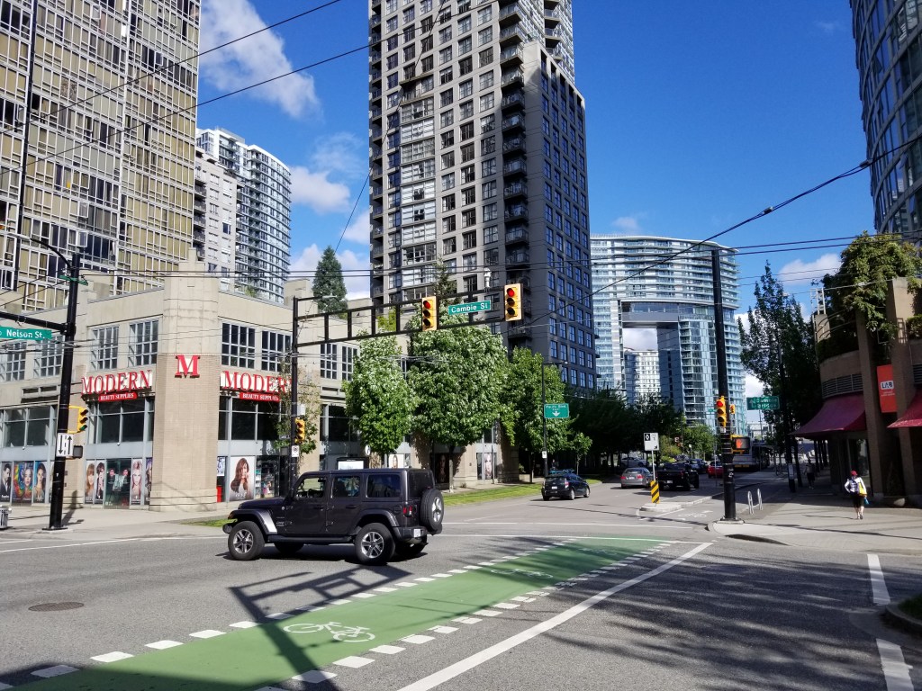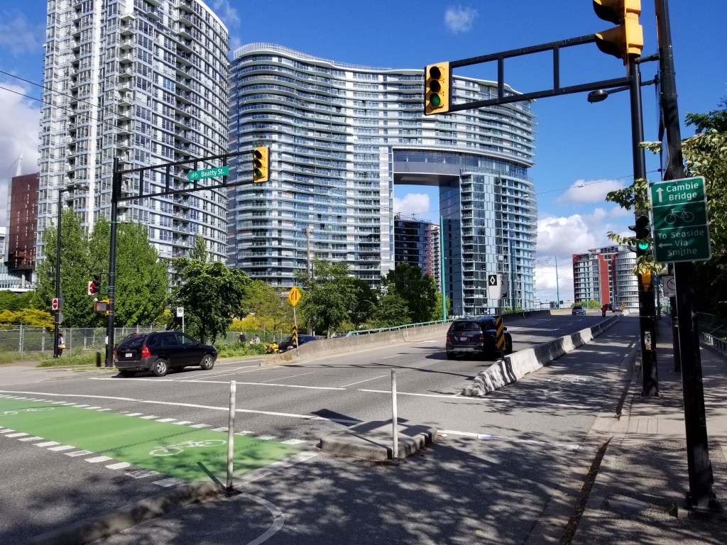 There are two distinct sections of the street. North of False Creek, the street runs on a northeast-southwest alignment (following the rotated street grid within Downtown Vancouver). As such, the street direction is approximately 45 degrees to that of the Cambie Bridge, and there is no seamless connection between the two. Instead, Nelson Street carries southbound traffic onto the bridge, and Smithe Street carries northbound traffic away from the bridge. The downtown section of Cambie Street runs from Water Street in Gastown in the north to Pacific Boulevard in Yaletown in the south and is a two-way street for its length.