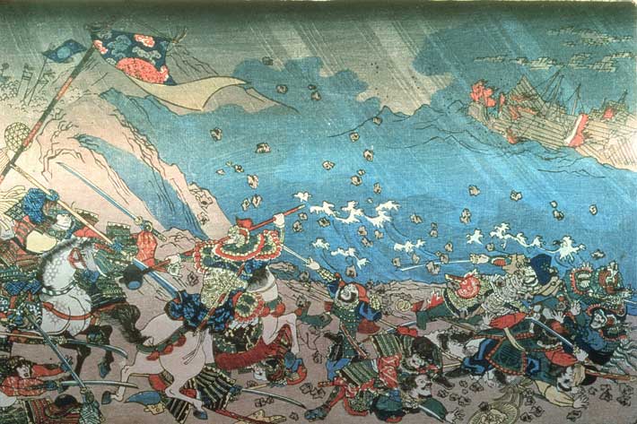 The samurai warriors rode out against the Mongol forces for individual combat, but the Mongols held their formation. As usual, the Mongols fought as a united force, not as individuals. Instead of coming out for duels, the Mongols bombarded the samurai with exploding missiles and showered them in arrows. The Mongols slaughtered the famed Japanese warriors, and the remaining Japanese withdrew from the coastal zone inland to a fortress. The Mongol forces did not chase the fleeing Japanese into an area about which they lacked reliable intelligence. Instead, they left the battlefield victorious but damaged, and they reloaded the men, horses, and supplies on the ship. The plan of the Mongols remains a mystery. Were they going to return the next day to pursue the Japanese? After winning this battle, did they intend to move farther along the coast and attack at another point? Had they been sent as a test probe to assess Japanese reaction and tactics? Were they more badly damaged in the fight than they appeared and therefore sought to retreat?