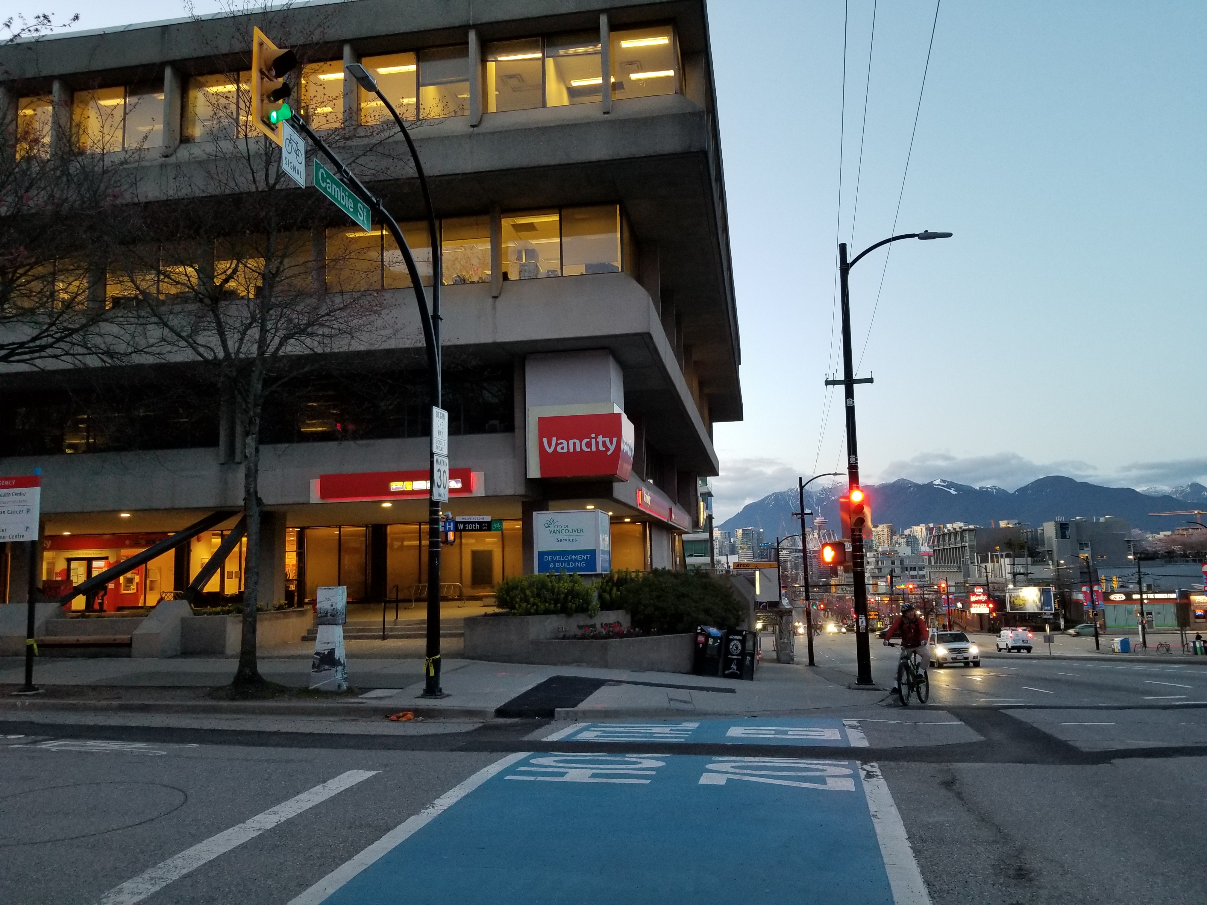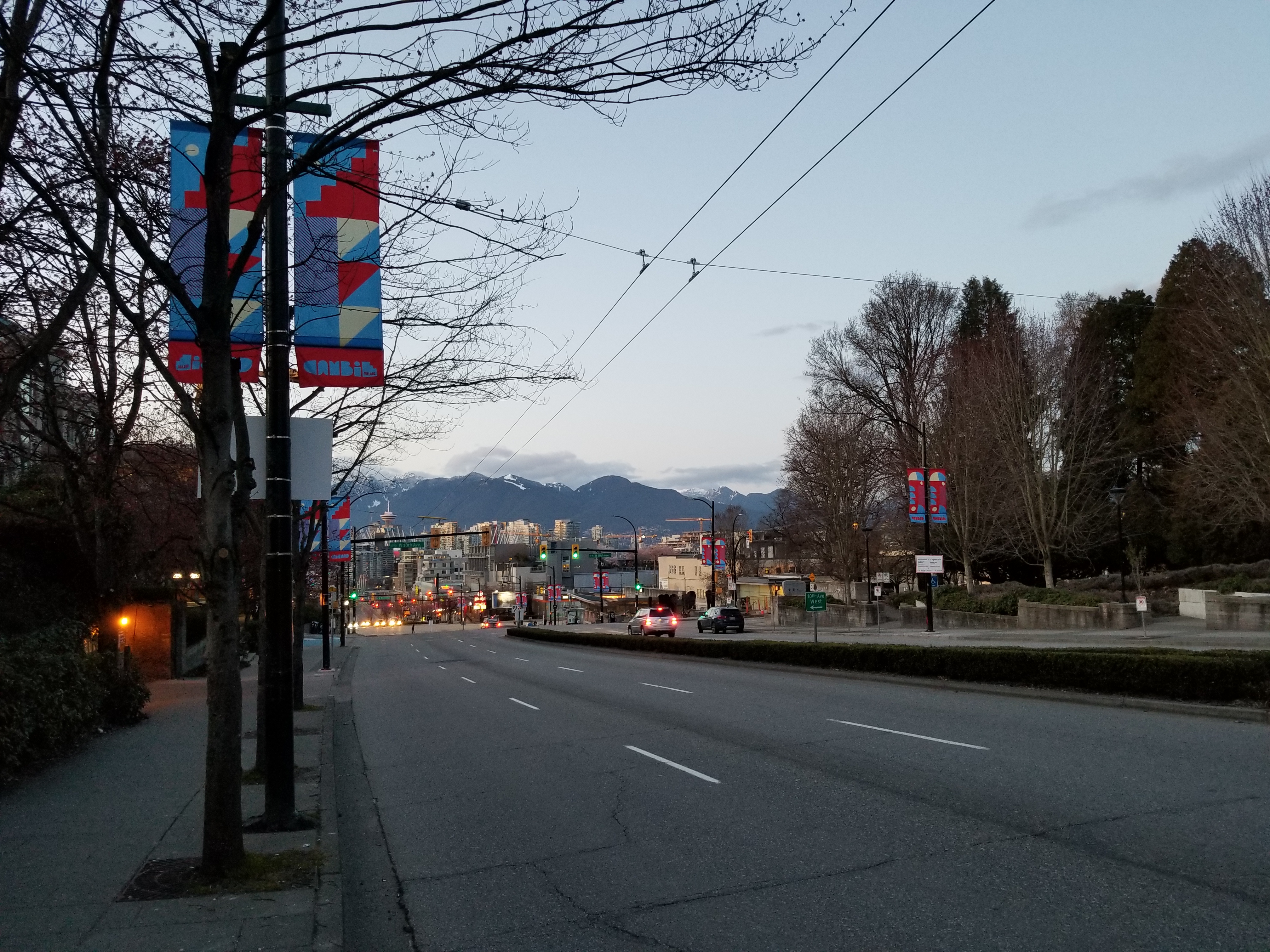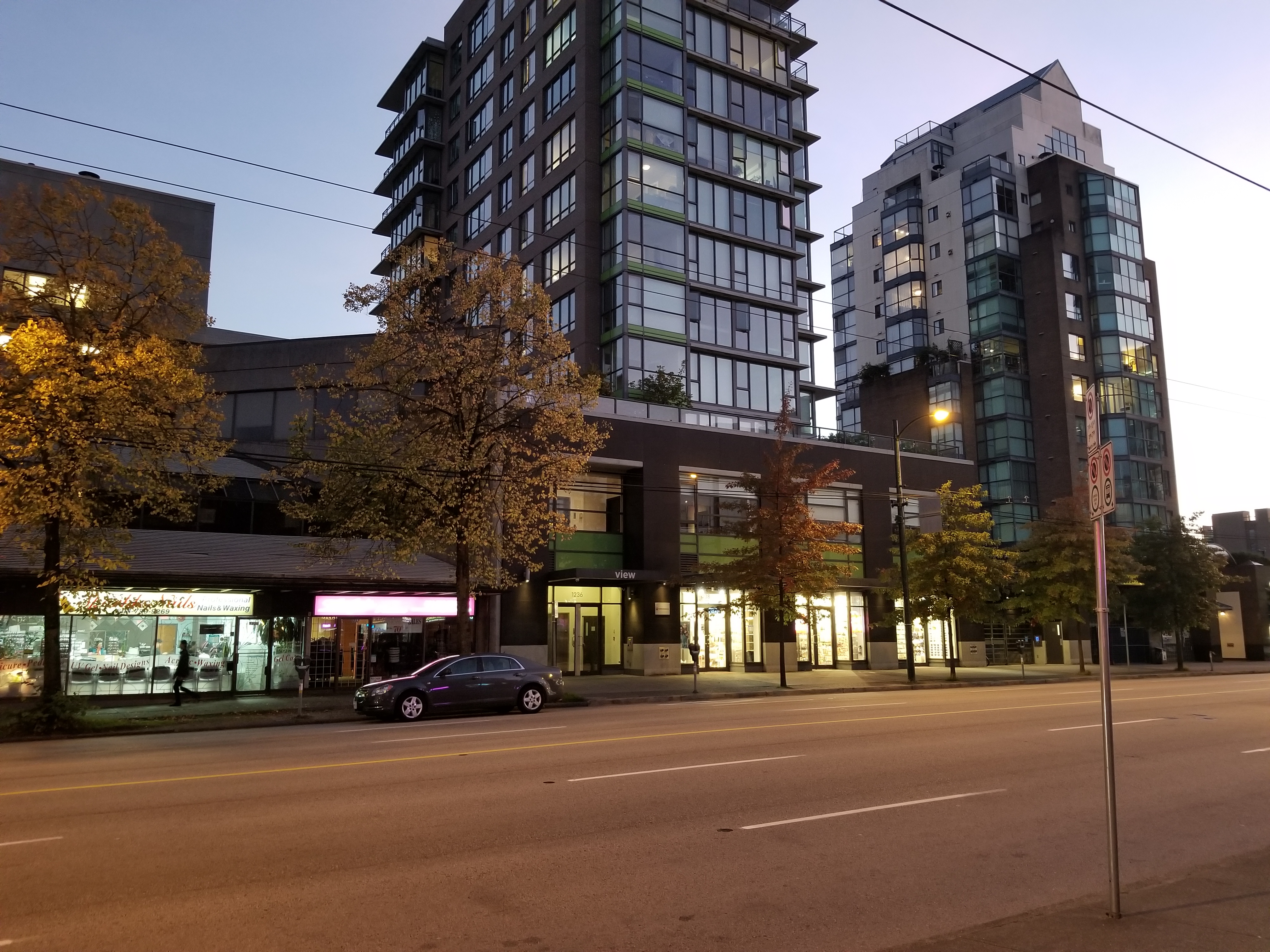 The route begins as “West Broadway” at the intersection of Wallace Crescent and 8th Avenue, in the affluent residential neighbourhood of West Point Grey, a few kilometres east of the University of British Columbia (UBC). Past Alma Street, Broadway takes over from 10th Avenue as one of Vancouver’s major thoroughfares, as it enters Greek West Broadway (or Greektown) section of Vancouver’s Kitsilano district. East of here are several blocks of generally trendy, upscale shops interspersed with low-rise apartment blocks and small supermarkets. The surrounding neighbourhoods generally consist of large, older homes dating from the early twentieth century, many of which have been subdivided into rental suites.