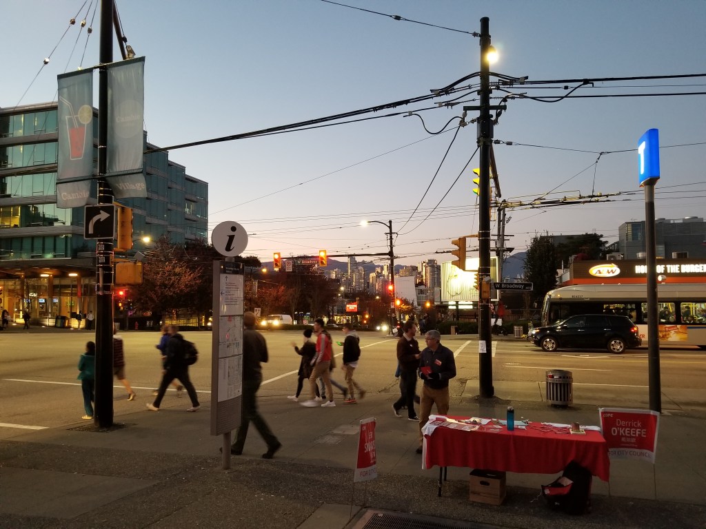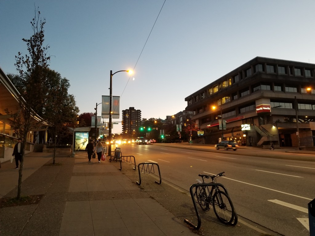 The route begins as “West Broadway” at the intersection of Wallace Crescent and 8th Avenue, in the affluent residential neighbourhood of West Point Grey, a few kilometres east of the University of British Columbia (UBC). Past Alma Street, Broadway takes over from 10th Avenue as one of Vancouver’s major thoroughfares, as it enters Greek West Broadway (or Greektown) section of Vancouver’s Kitsilano district. East of here are several blocks of generally trendy, upscale shops interspersed with low-rise apartment blocks and small supermarkets. The surrounding neighbourhoods generally consist of large, older homes dating from the early twentieth century, many of which have been subdivided into rental suites.