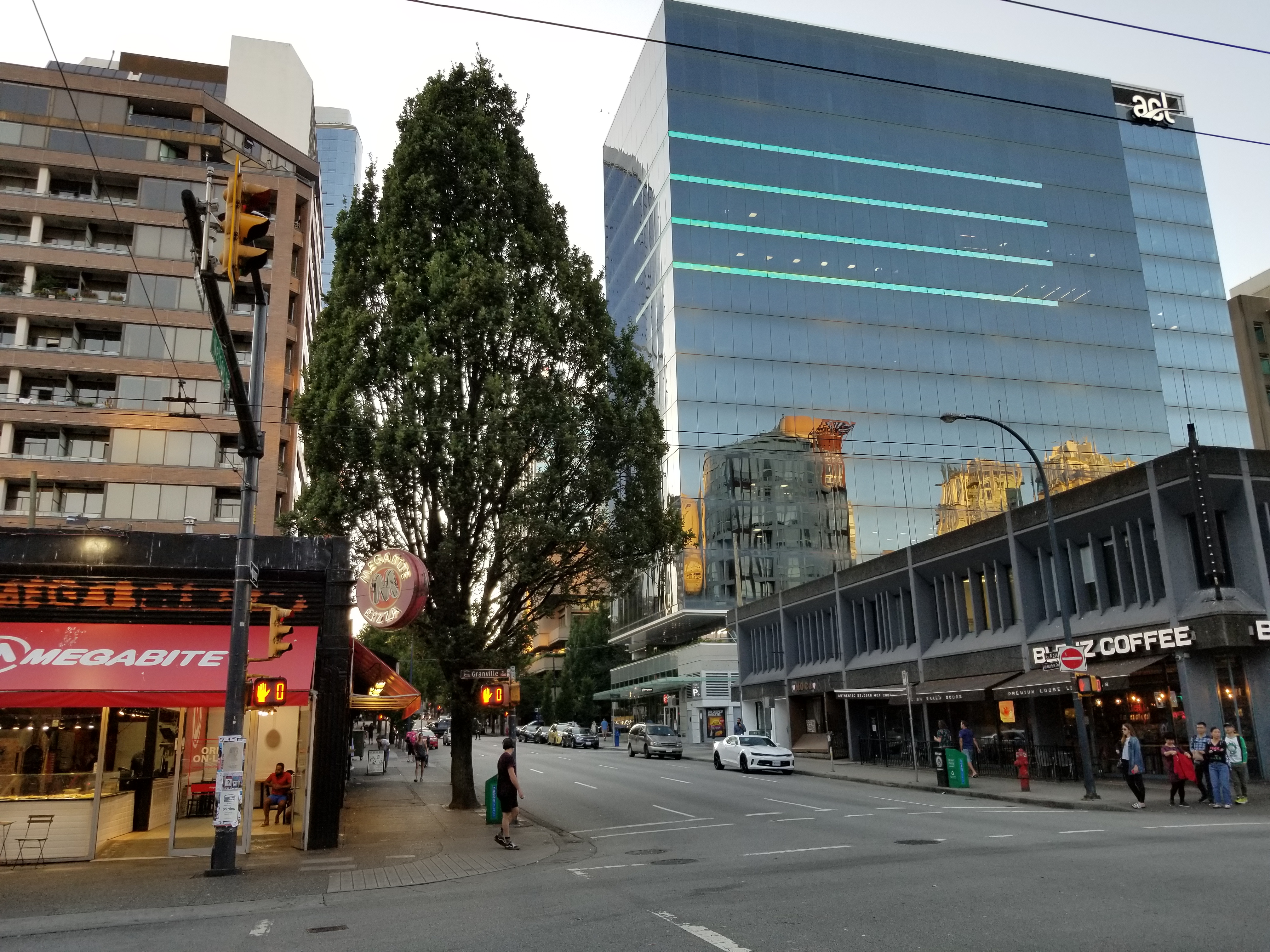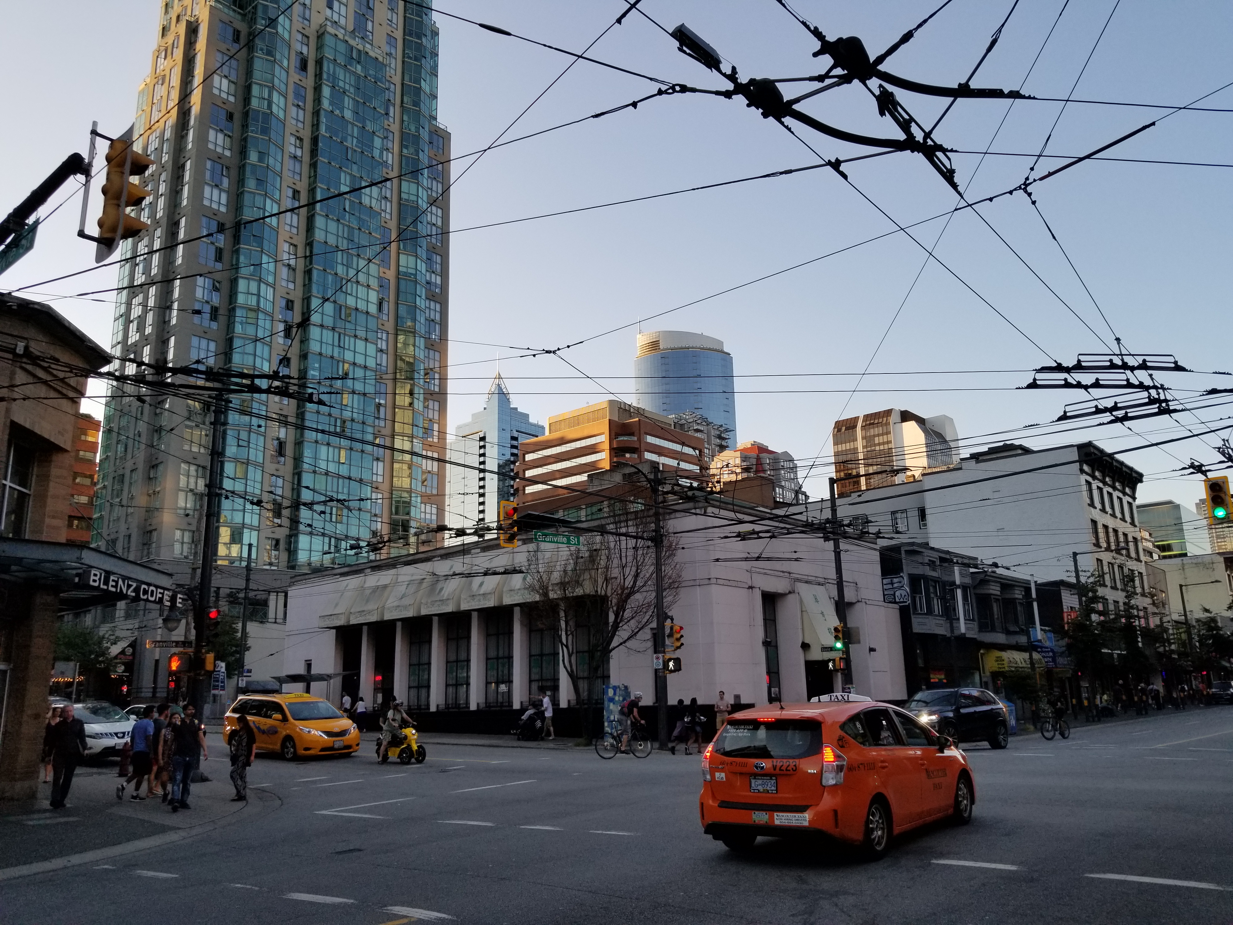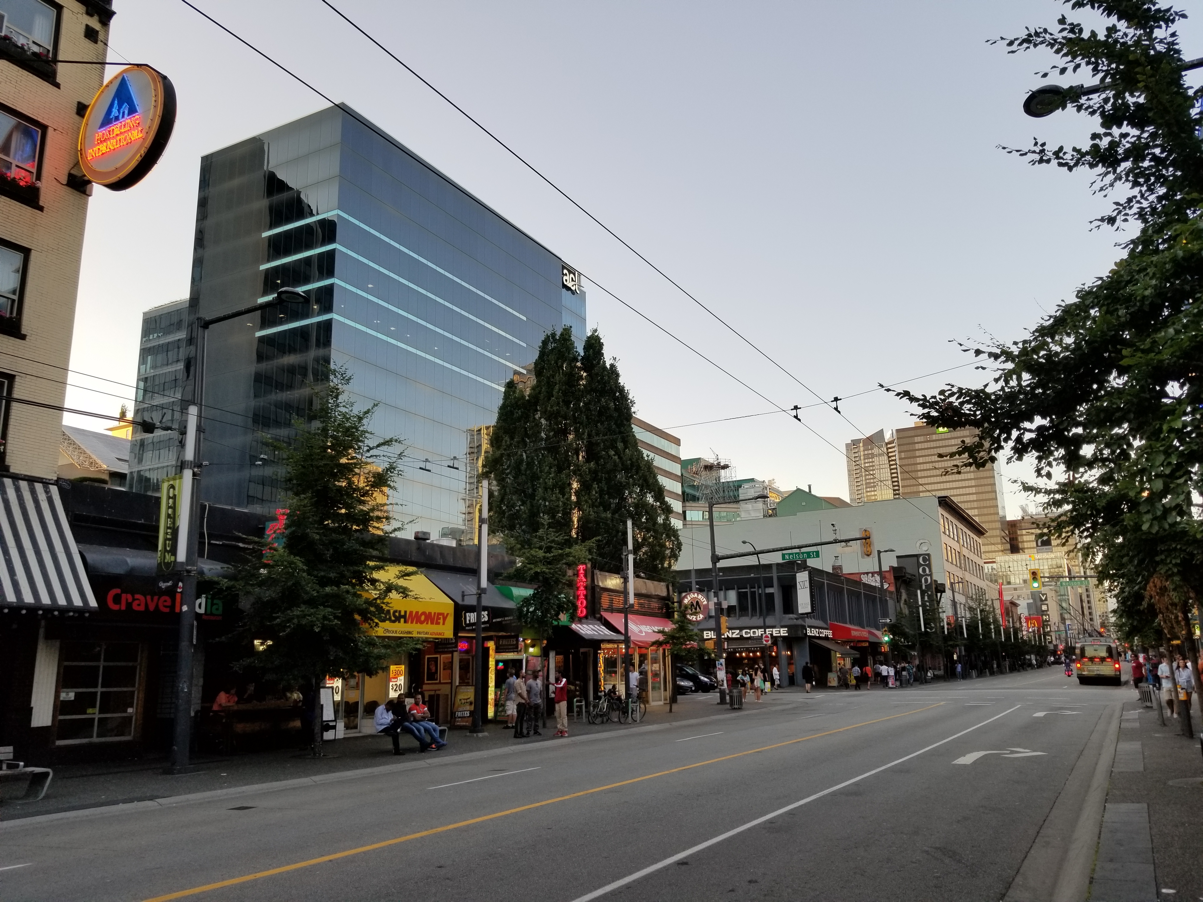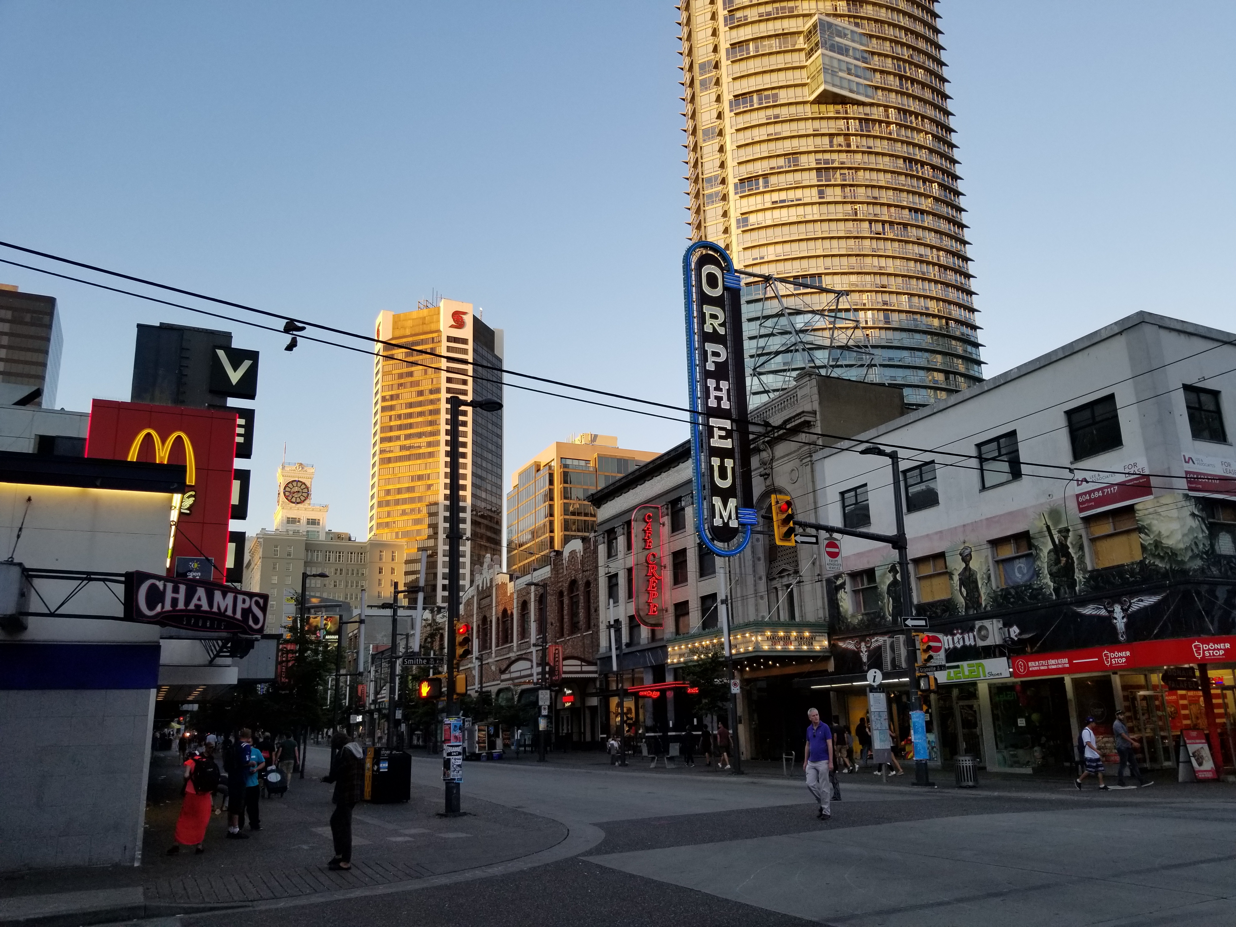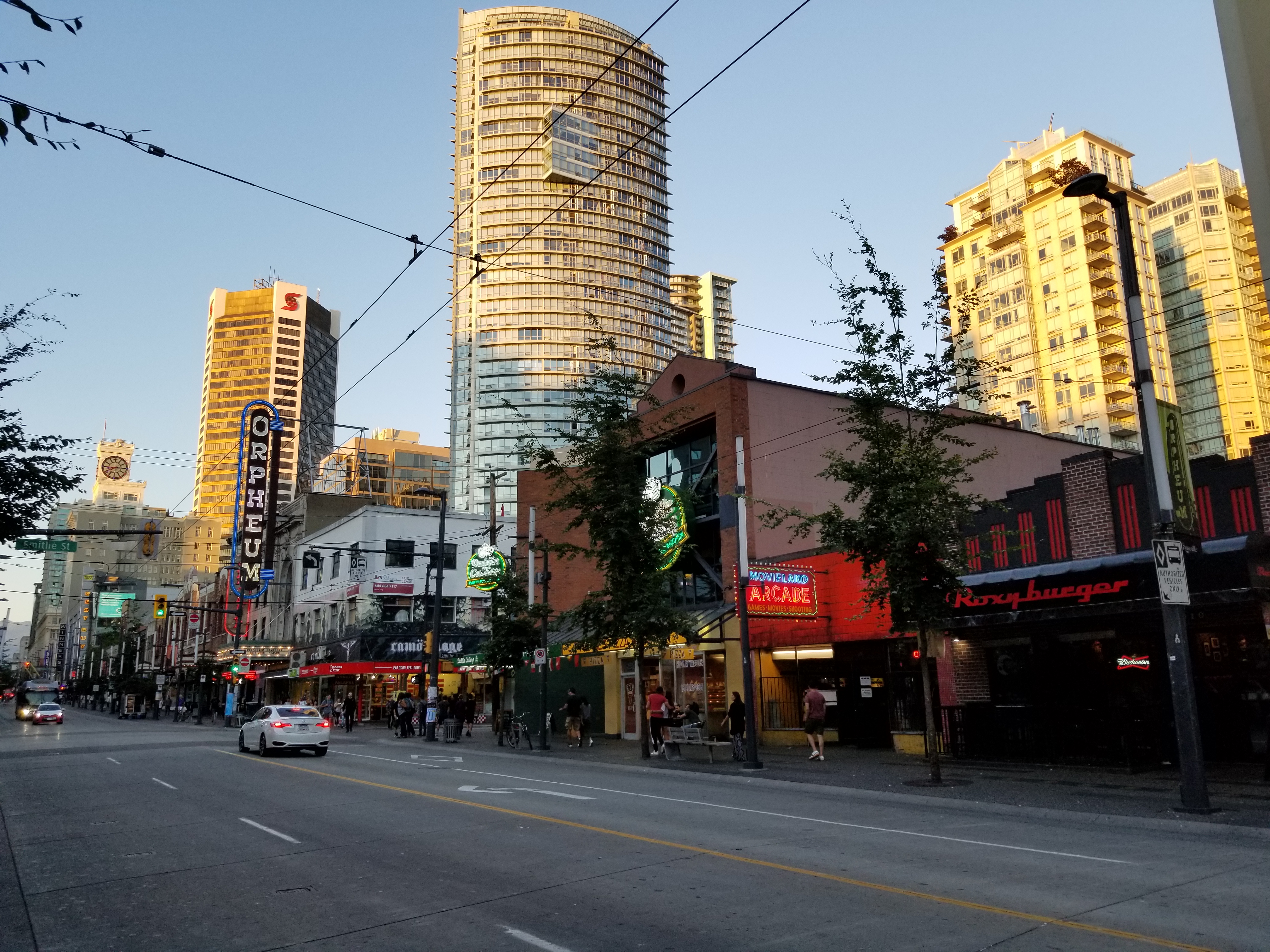 Towards the middle of the twentieth century, the Downtown portion of Granville Street had become a flourishing centre for entertainment, known for its cinemas (built along the “Theatre Row,” from the Granville Bridge to where Granville Street intersects Robson Street), restaurants, clubs, the Vogue and Orpheum theatres, and, later, arcades, pizza parlours, pawn stores, pornography shops and strip clubs.