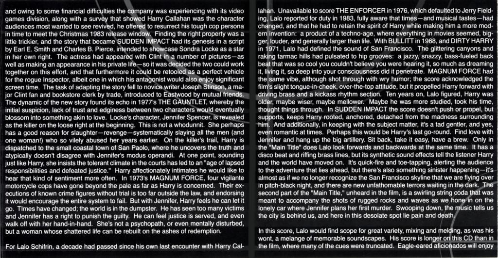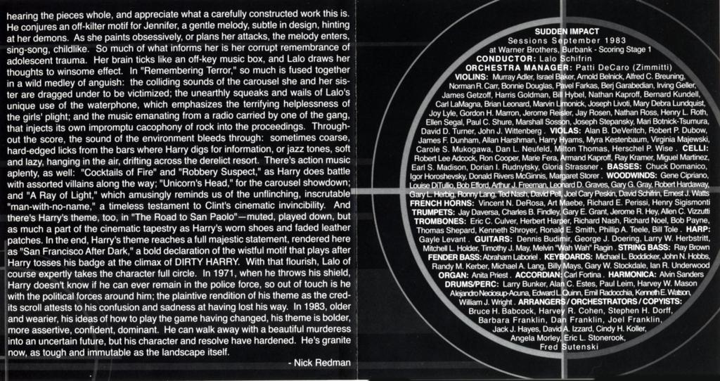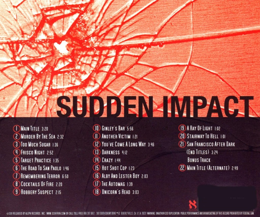 Despite that – this is impressive music, and by and large follows the established Dirty Harry sound impressively while updating it to the then-current time. The album features great sound quality and informative notes from Nick Redman. Sudden Impact may not be a score for everyone, but for those who enjoy more challenging music it’s a sure-fire winner. It is available on Schifrin’s own label Aleph Records, who have also previously released the music from the first three films in the series.