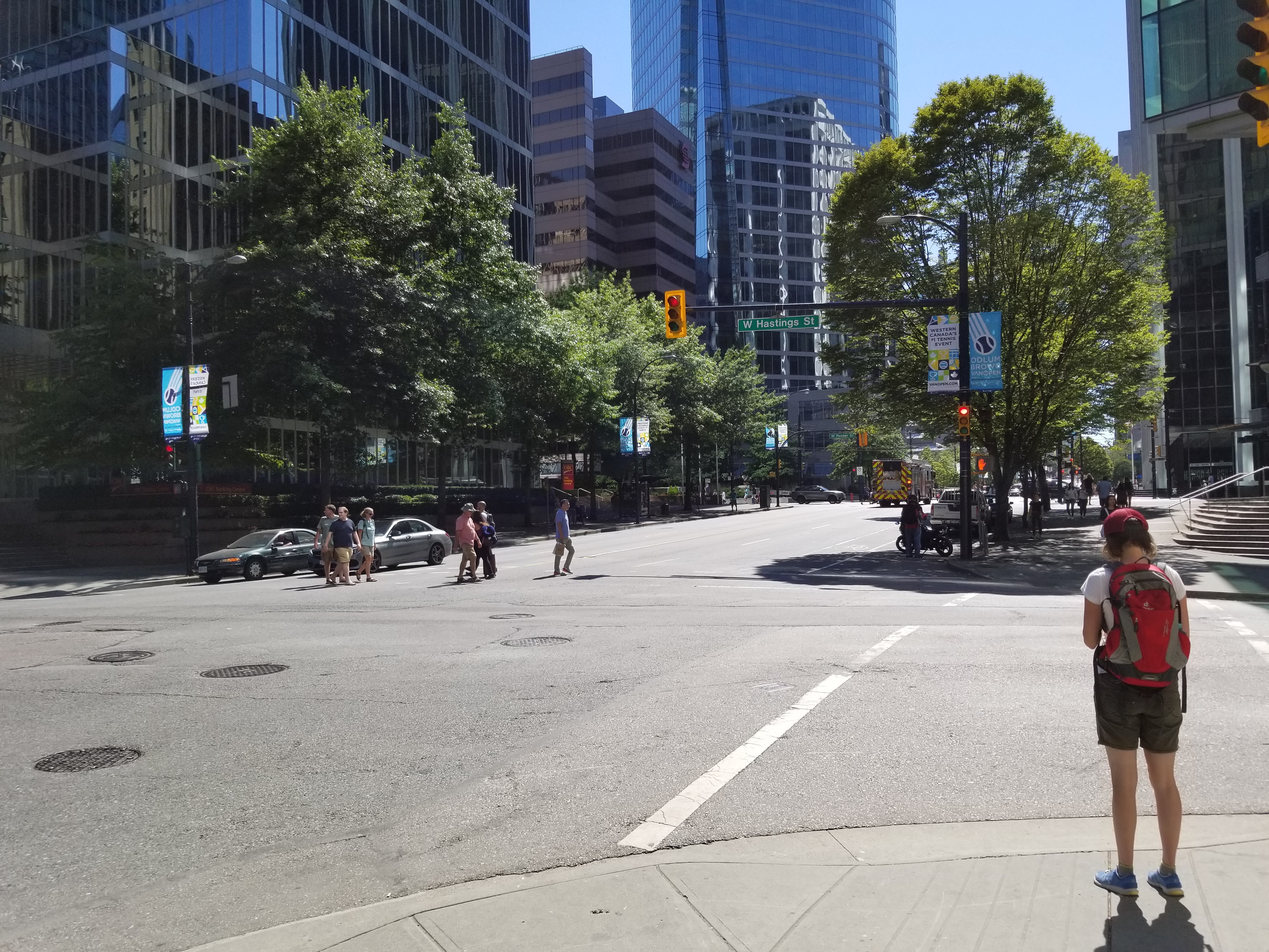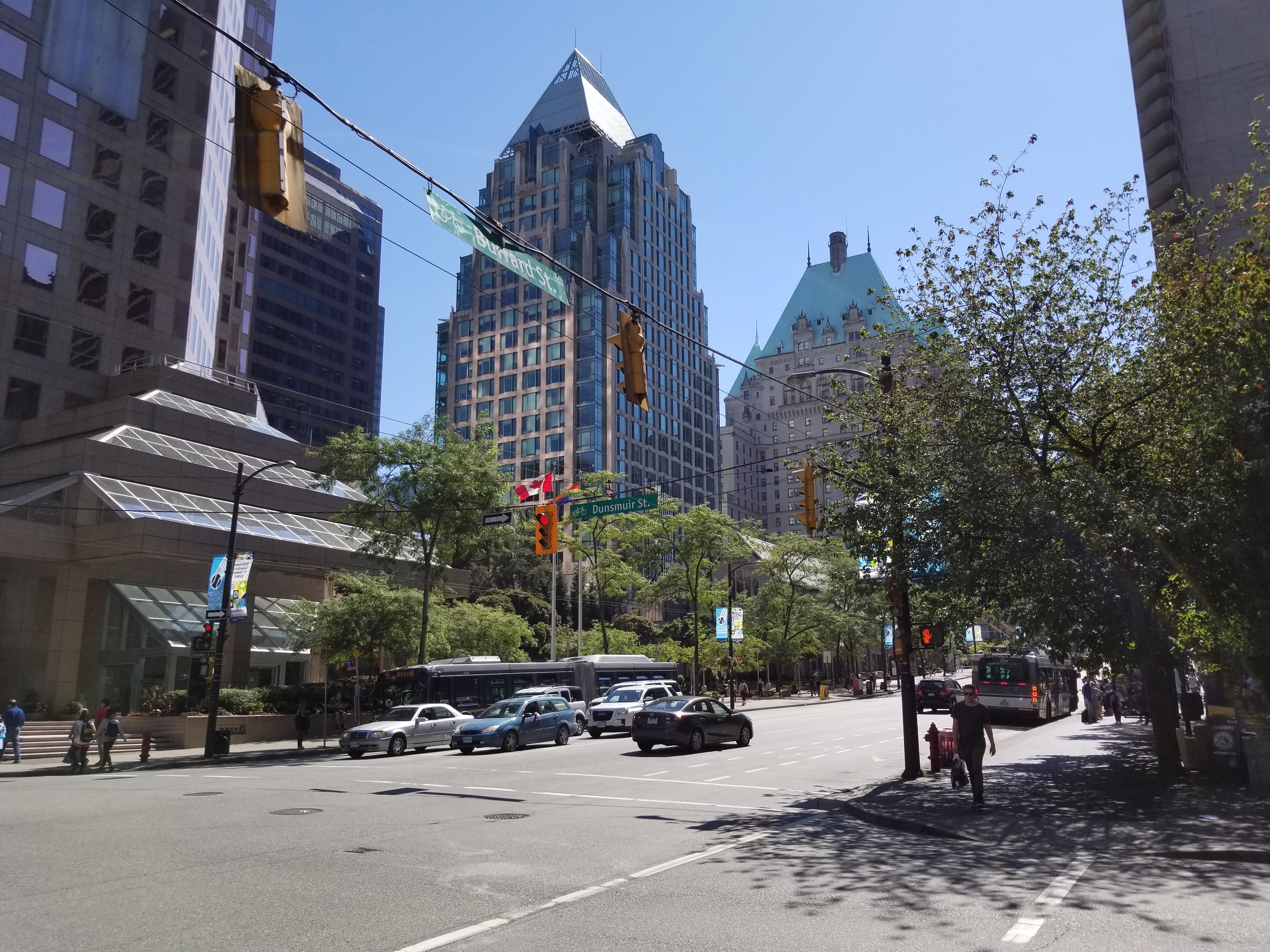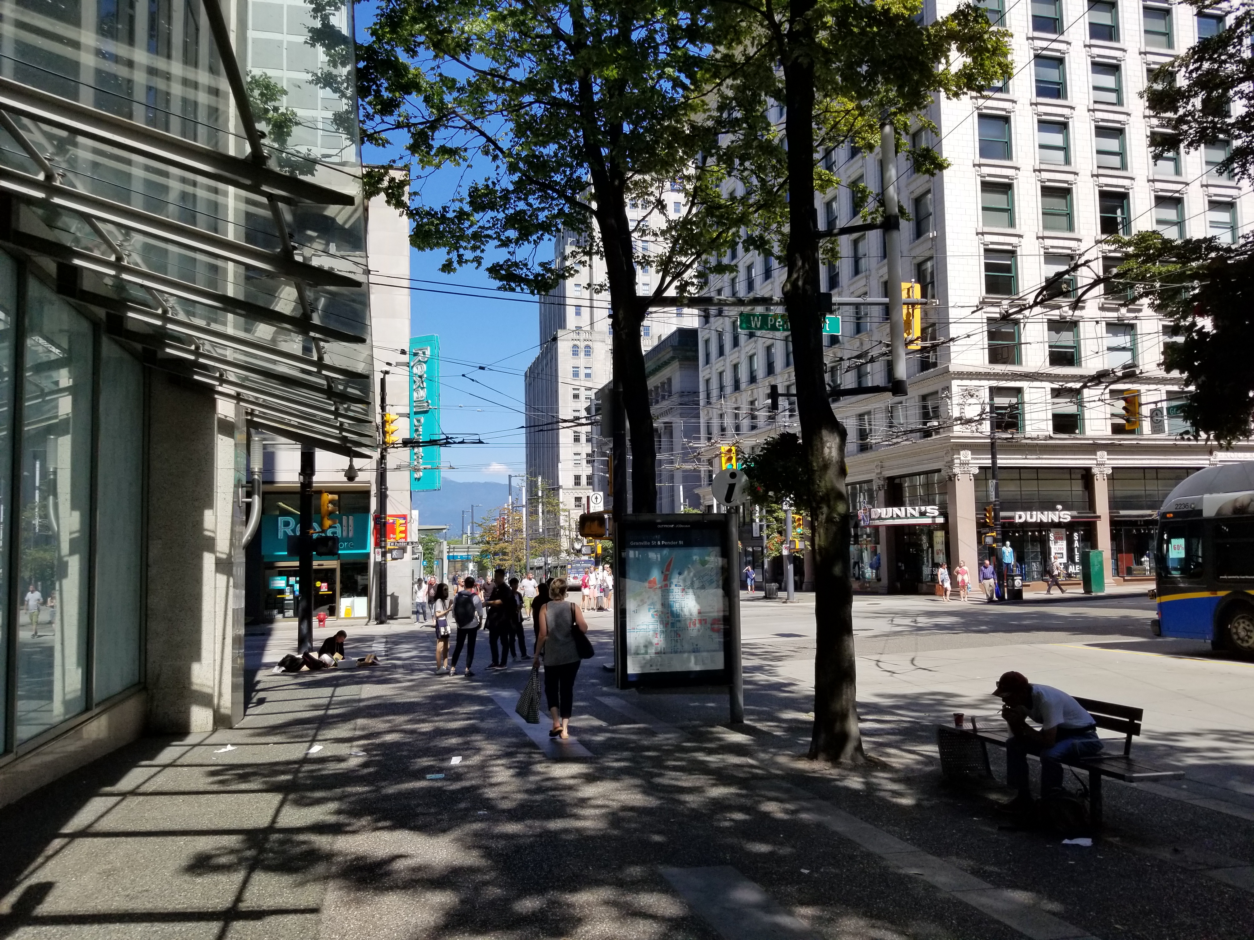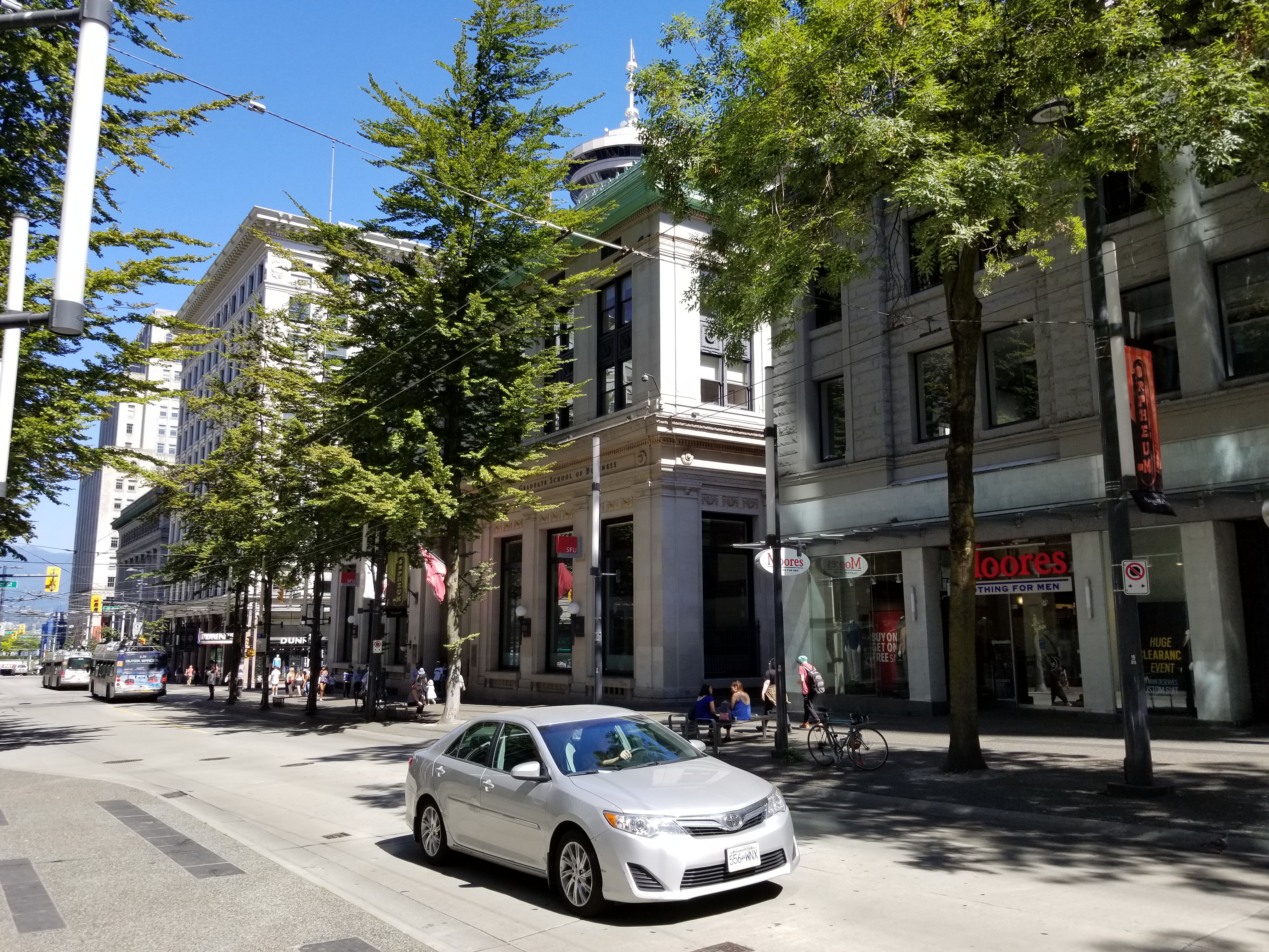Formally named in 1885 for Rear-Admiral George Fowler Hastings of the Royal Navy, the street runs past such well-known Vancouver landmarks as the Marine Building, the Vancouver Club, Sinclair Centre, Harbour Centre (once Spencer’s, Eaton’s, then Sears and now the downtown campus of Simon Fraser University), Dominion Building and Victory Square (the location of the city’s original courthouse) and the Woodward’s Building; located in the old Dunn’s Tailors building at Homer and West Hastings is the campus of the Vancouver Film School, while on the corner of Cambie is the Carter-Cotton Building, the former headquarters of the Vancouver Province newspaper. East of Woodward’s, the street forms the heart of Vancouver’s historic original downtown, once known as the Great White Way because of its neon displays, and which is today the Downtown Eastside. Through the East End, after a stretch of warehouse-type commercial and wholesale businesses, the street forms one of the commercial cores for Vancouver’s Italian community in a mixed-ethnicity retail area in the area of Nanaimo Street, just east of which the Pacific National Exhibition and Playland are on the city of Vancouver’s eastern fringe. After leaving Vancouver, Hastings forms the core of a Burnaby retail neighbourhood known as the Heights and then traverses Capitol Hill to the Lochdale and Westridge areas.
