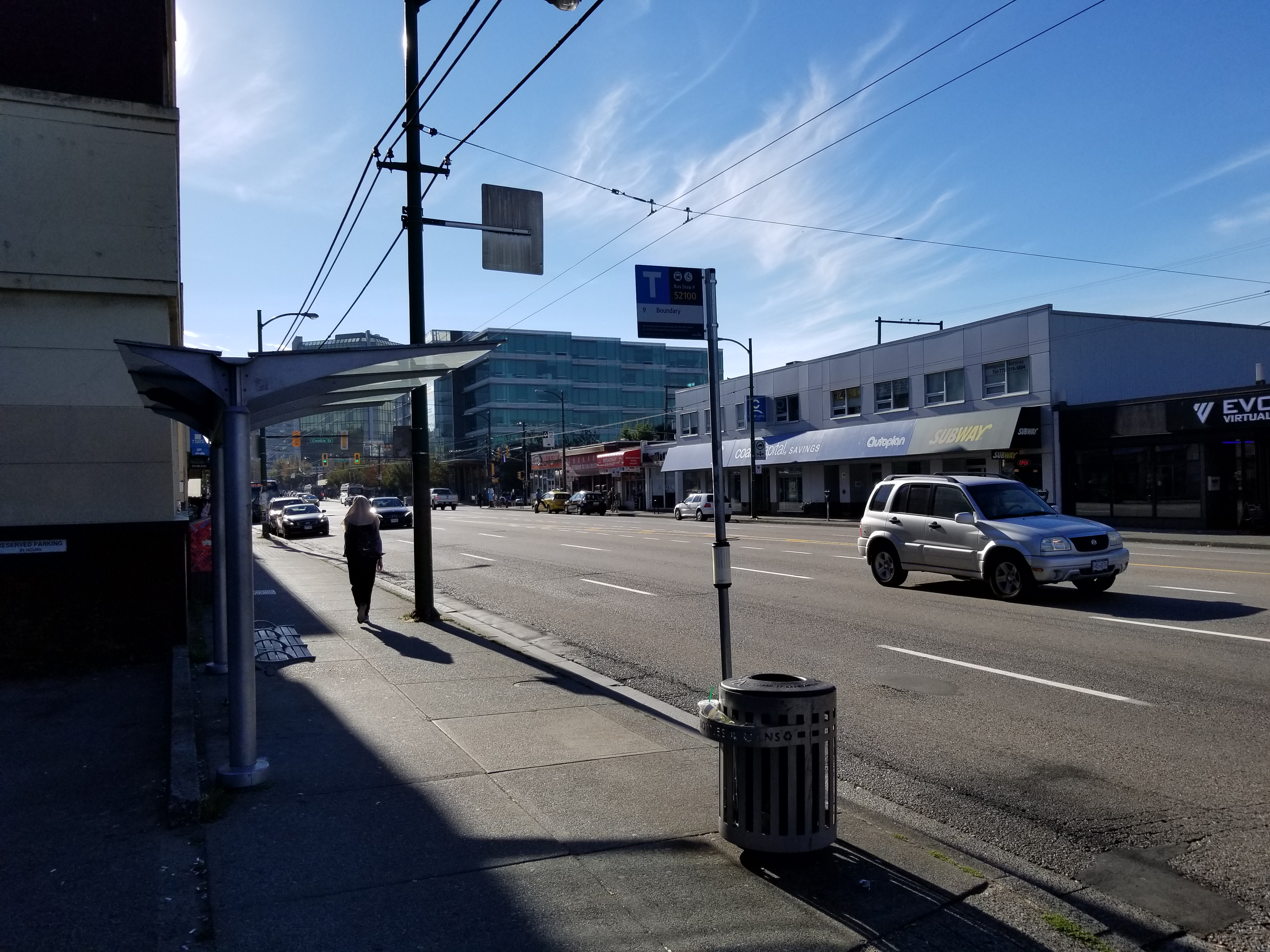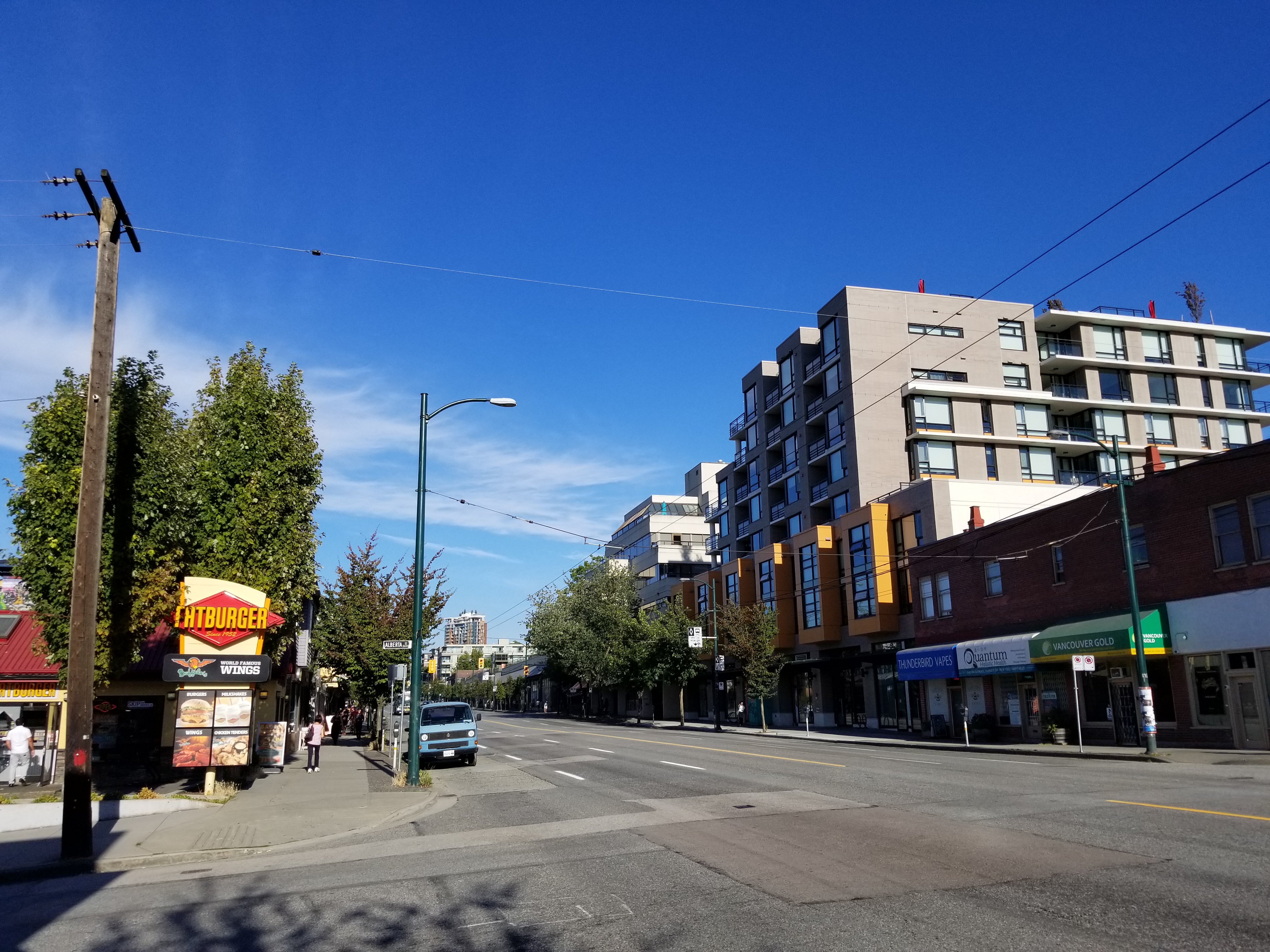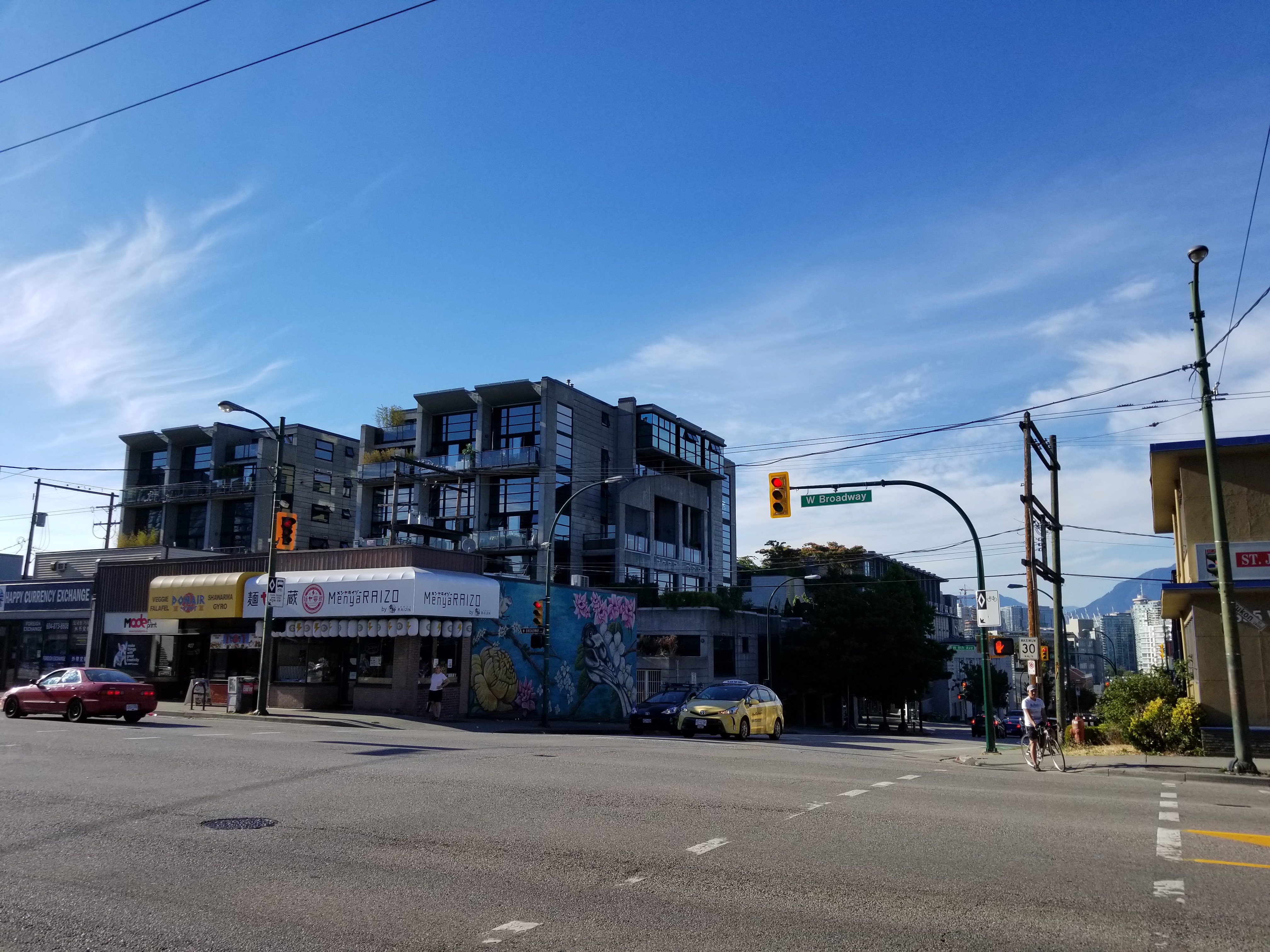 The route begins as “West Broadway” at the intersection of Wallace Crescent and 8th Avenue, in the affluent residential neighbourhood of West Point Grey, a few kilometres east of the University of British Columbia (UBC). Past Alma Street, Broadway takes over from 10th Avenue as one of Vancouver’s major thoroughfares, as it enters Greek West Broadway (or Greektown) section of Vancouver’s Kitsilano district. East of here are several blocks of generally trendy, upscale shops interspersed with low-rise apartment blocks and small supermarkets. The surrounding neighbourhoods generally consist of large, older homes dating from the early twentieth century, many of which have been subdivided into rental suites.