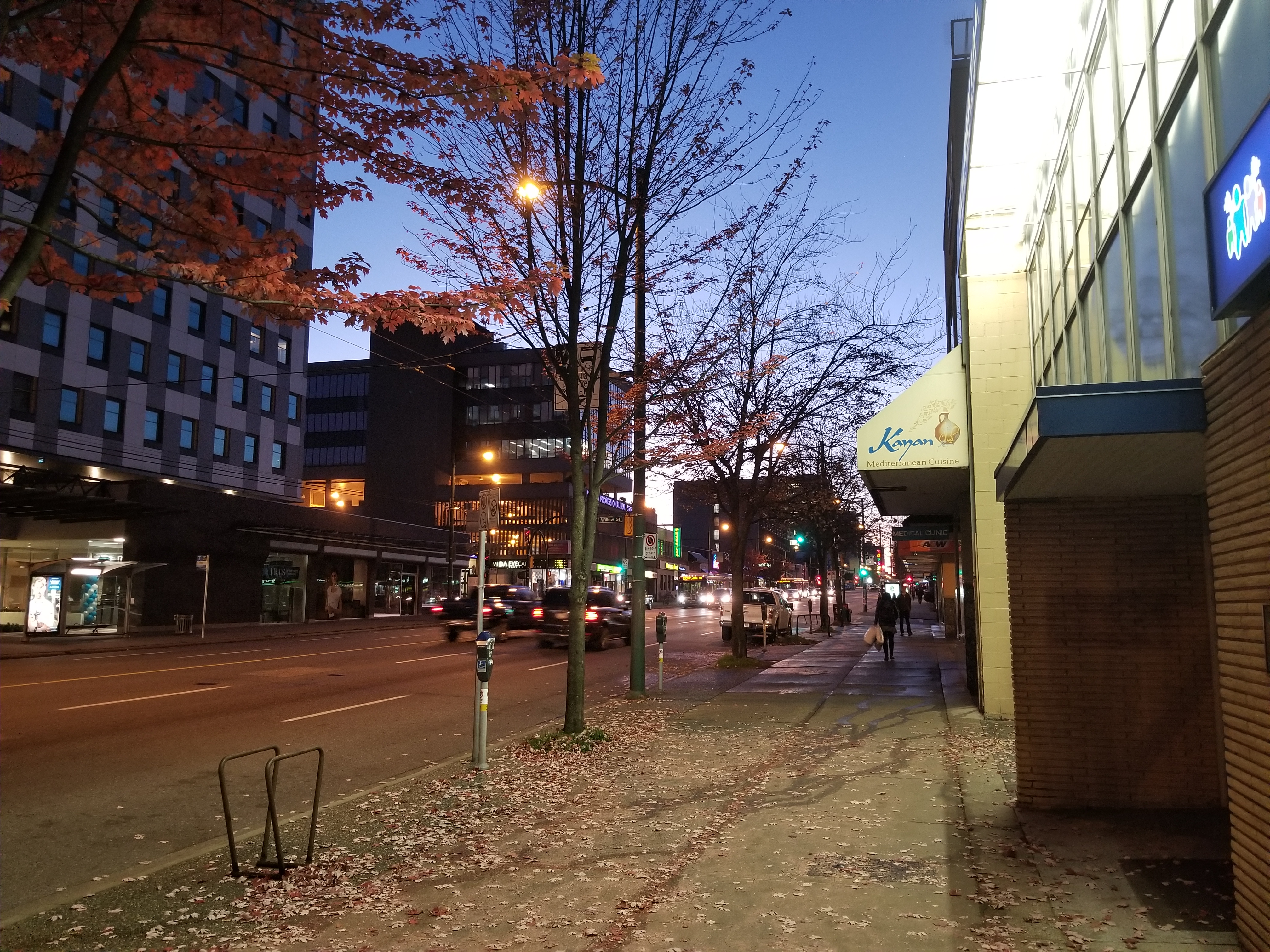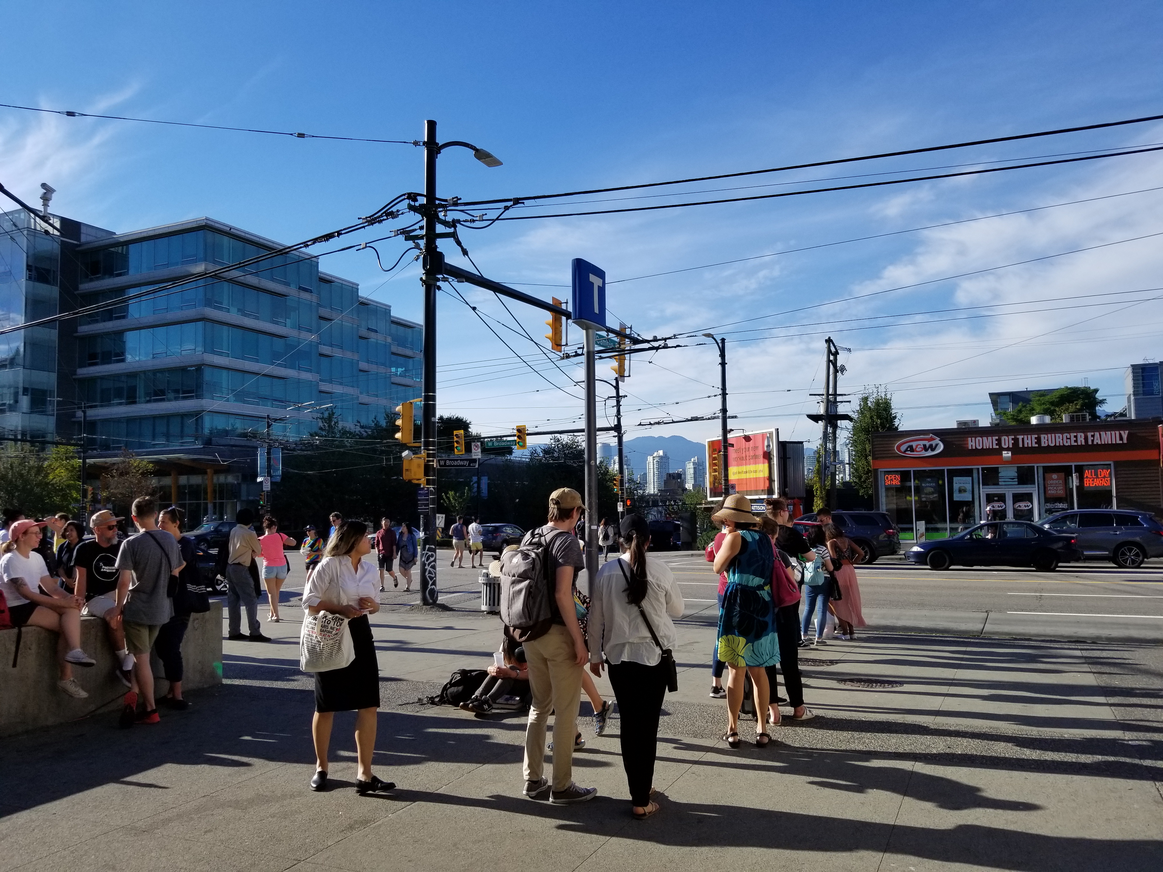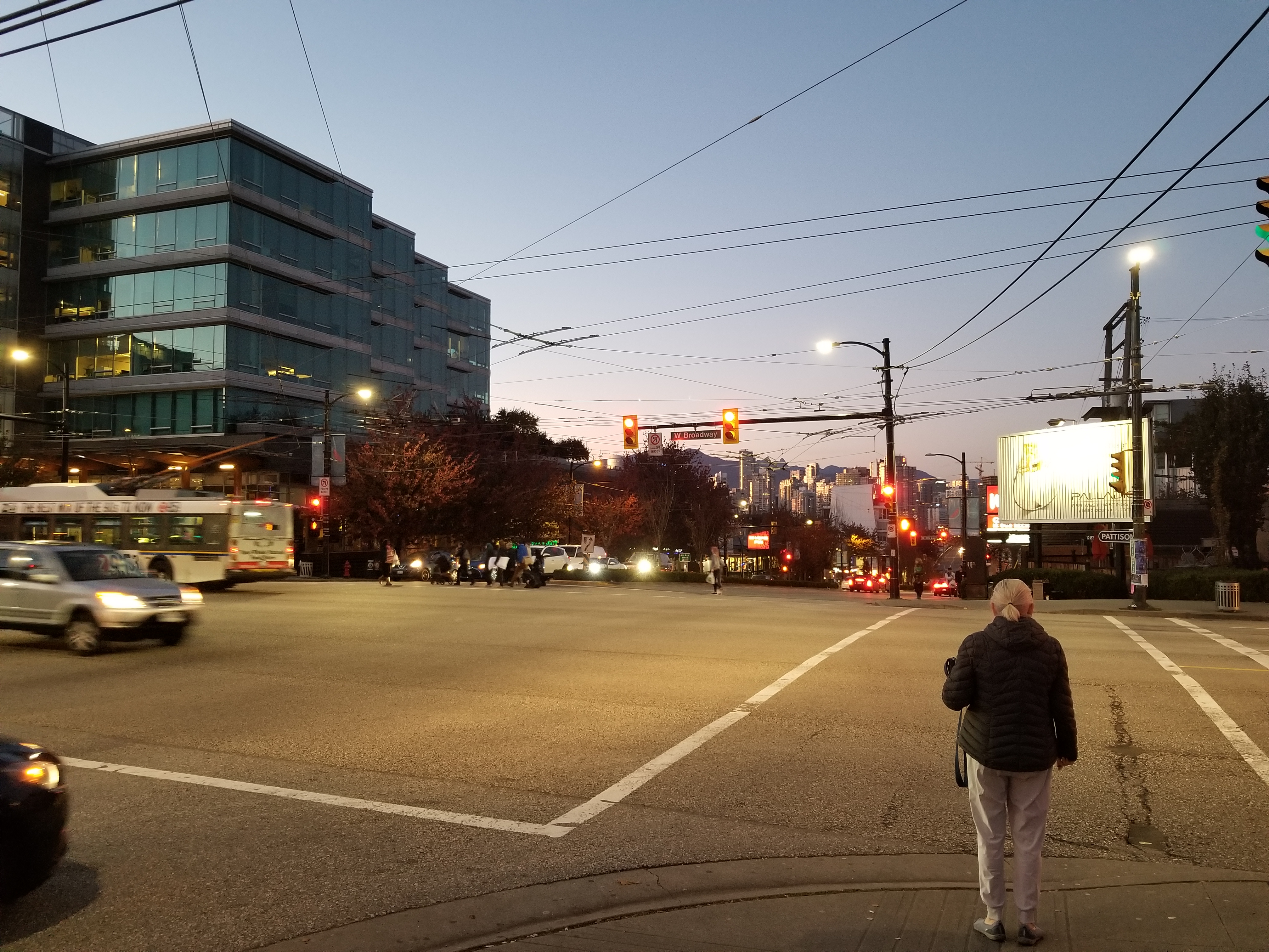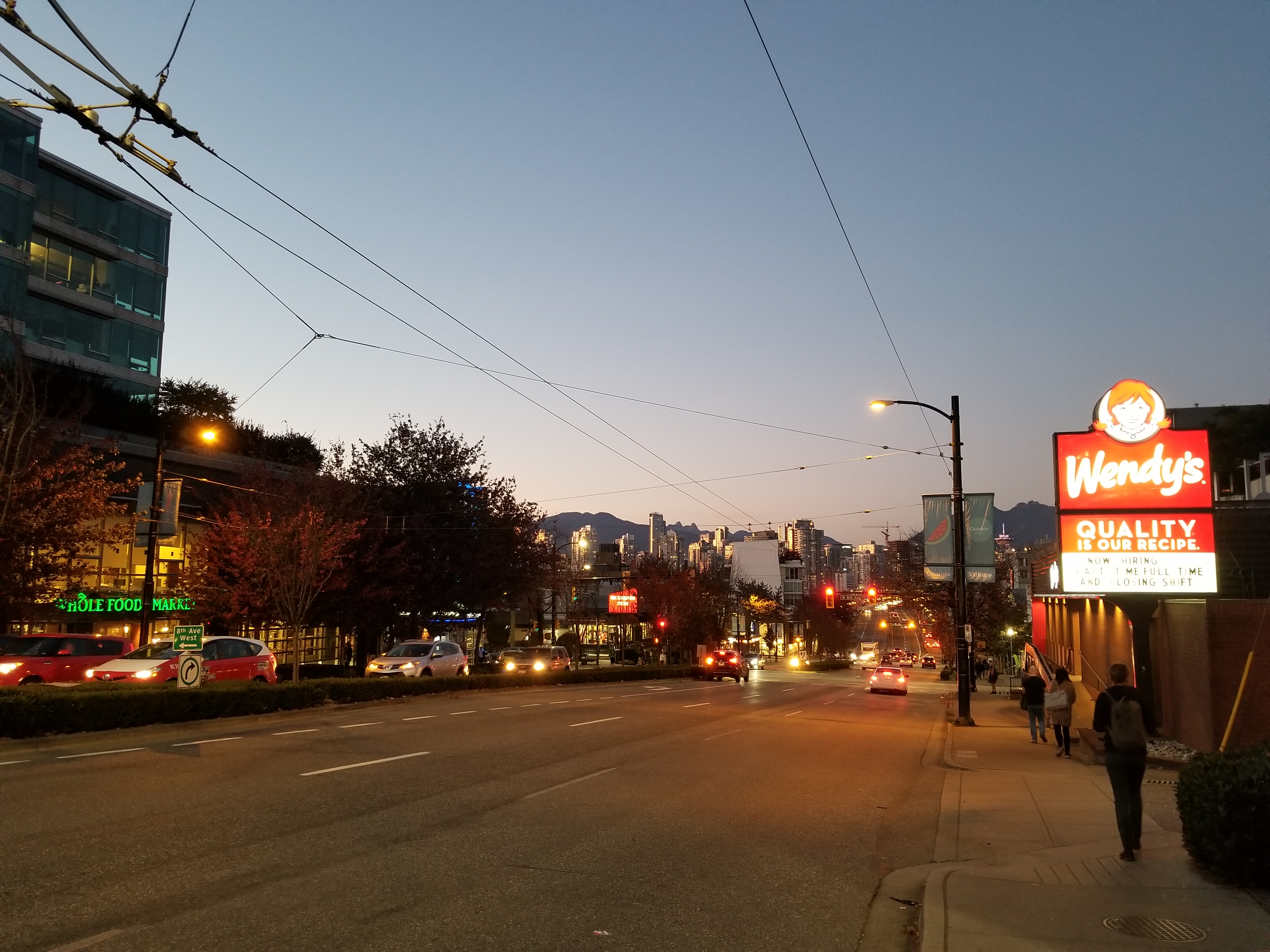 The route begins as “West Broadway” at the intersection of Wallace Crescent and 8th Avenue, in the affluent residential neighbourhood of West Point Grey, a few kilometres east of the University of British Columbia (UBC). Past Alma Street, Broadway takes over from 10th Avenue as one of Vancouver’s major thoroughfares, as it enters Greek West Broadway (or Greektown) section of Vancouver’s Kitsilano district. East of here are several blocks of generally trendy, upscale shops interspersed with low-rise apartment blocks and small supermarkets. The surrounding neighbourhoods generally consist of large, older homes dating from the early twentieth century, many of which have been subdivided into rental suites.