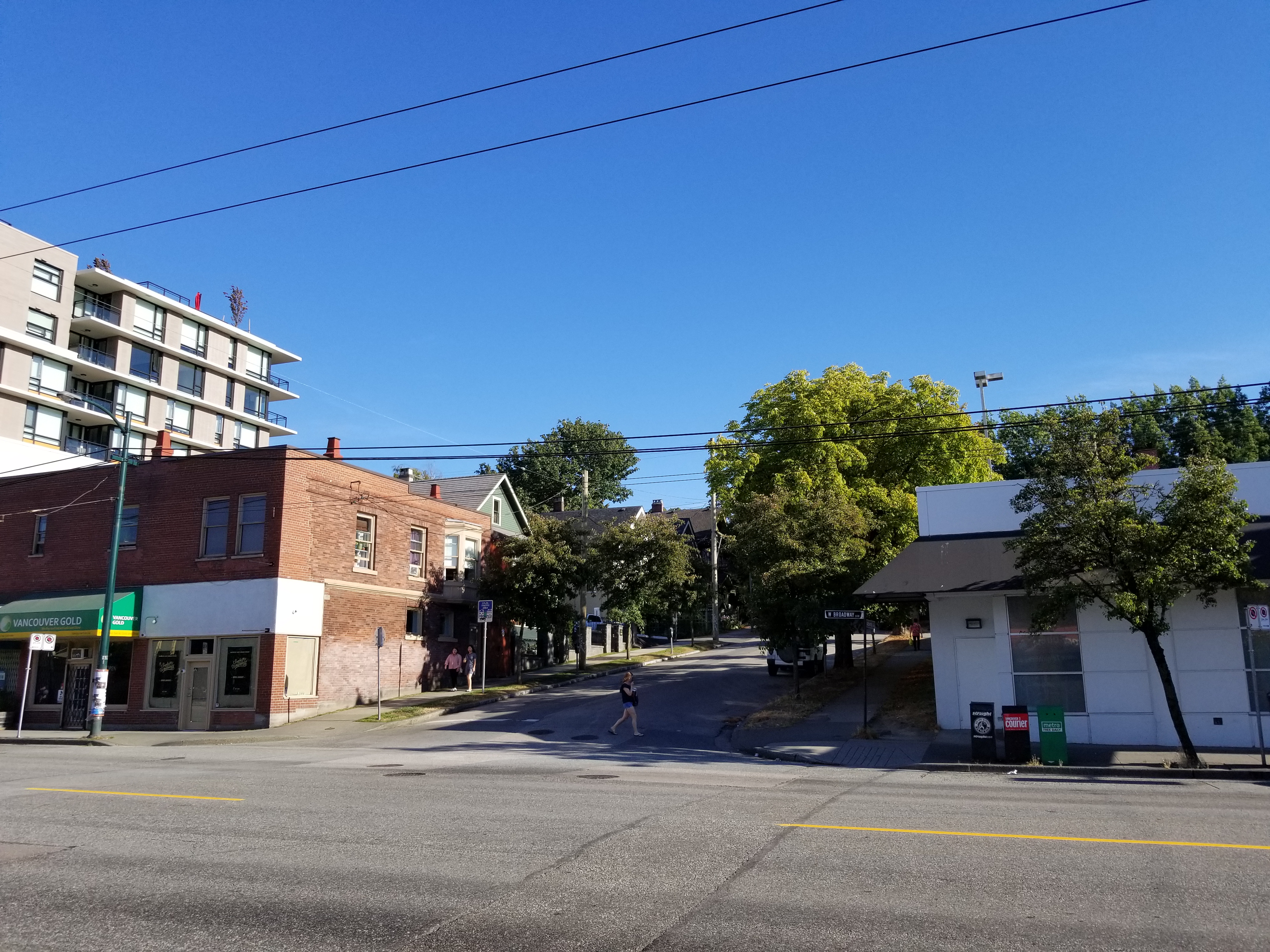 At Ontario Street, two blocks west of Main, the route becomes “East Broadway.” After bisecting Main and Kingsway, traffic on Broadway eases somewhat, and the character returns to a mix of small-to-medium apartment buildings and commercial establishments, interspersed with older homes – all considerably less affluent than those to the west. At Commercial Drive, Broadway passes by the Commercial–Broadway SkyTrain Station. Past here for several blocks, the neighbourhood consists predominantly of older residential homes.
