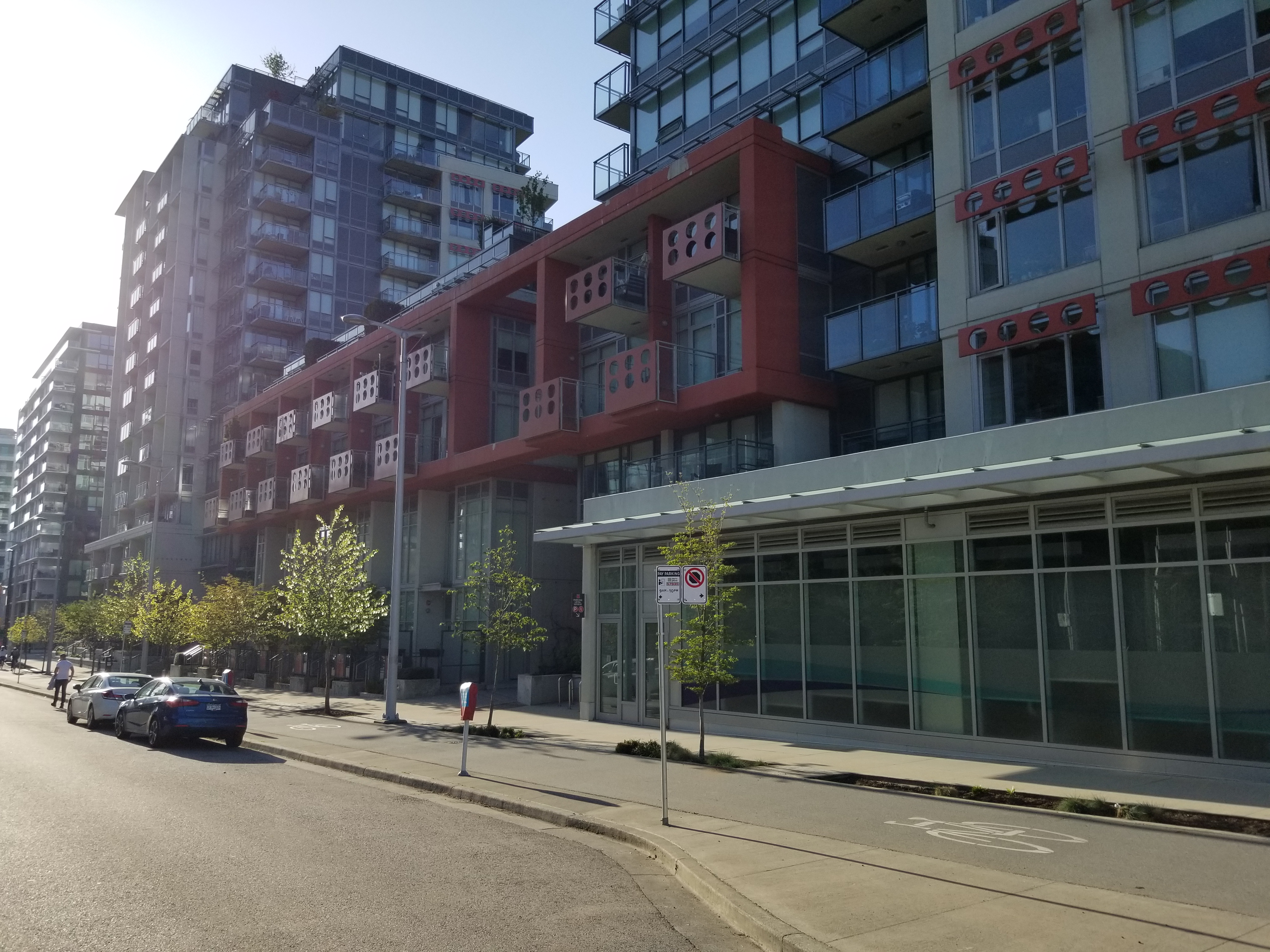 The university’s campus is located within a four-storey 26,600 square metres (286,320 sq ft) building in the False Creek Flats neighbourhood of Vancouver. Designed by Diamond Schmitt Architects and completed by EllisDon in 2017, the building houses student commons spaces, galleries, exhibition spaces, studios and three lecture theatres. The exterior facade of the building has white metal panels and glass reminiscent of a blank canvas, as well as back-painted glass spandrel panels to evoke a sequence of colours and transitions. The building’s colour palette was selected by faculty members in honour of Canadian painter Emily Carr. In addition, several Indigenous design elements were incorporated into the design of the building.