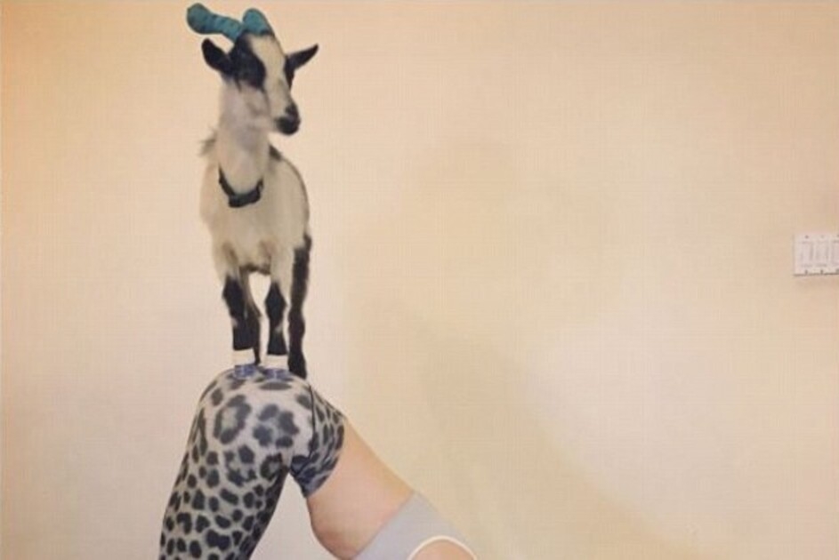 In some of the photos, you can see Sheen practicing a downward dog pose while a goat stands on his back.