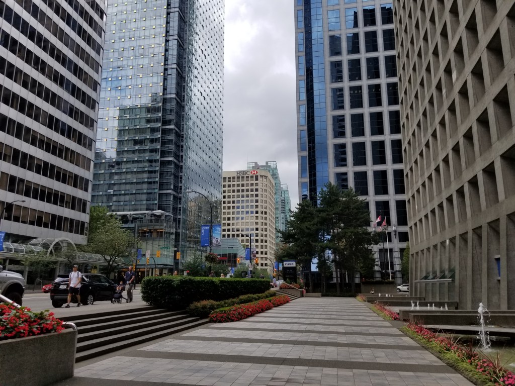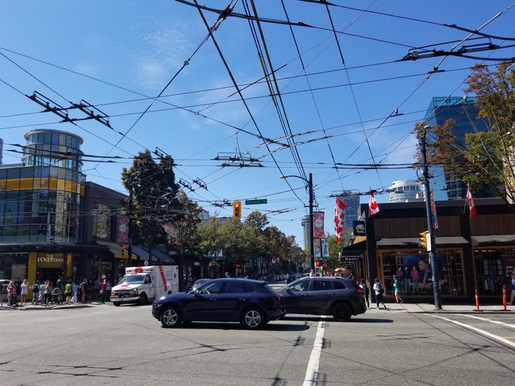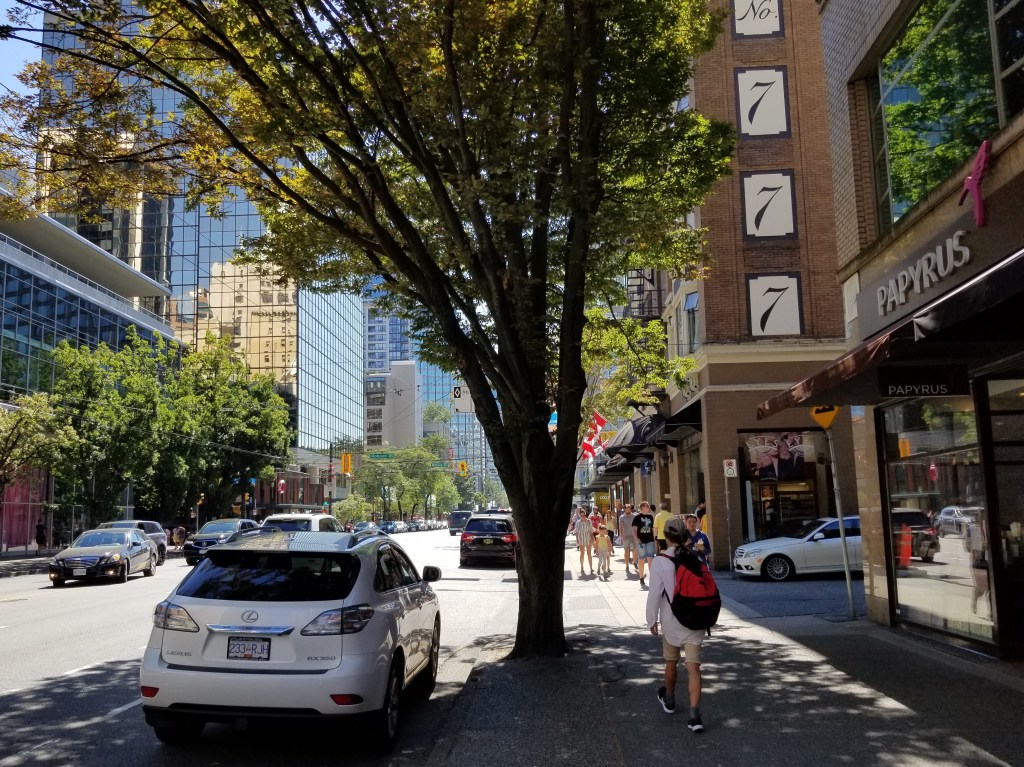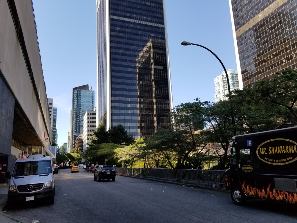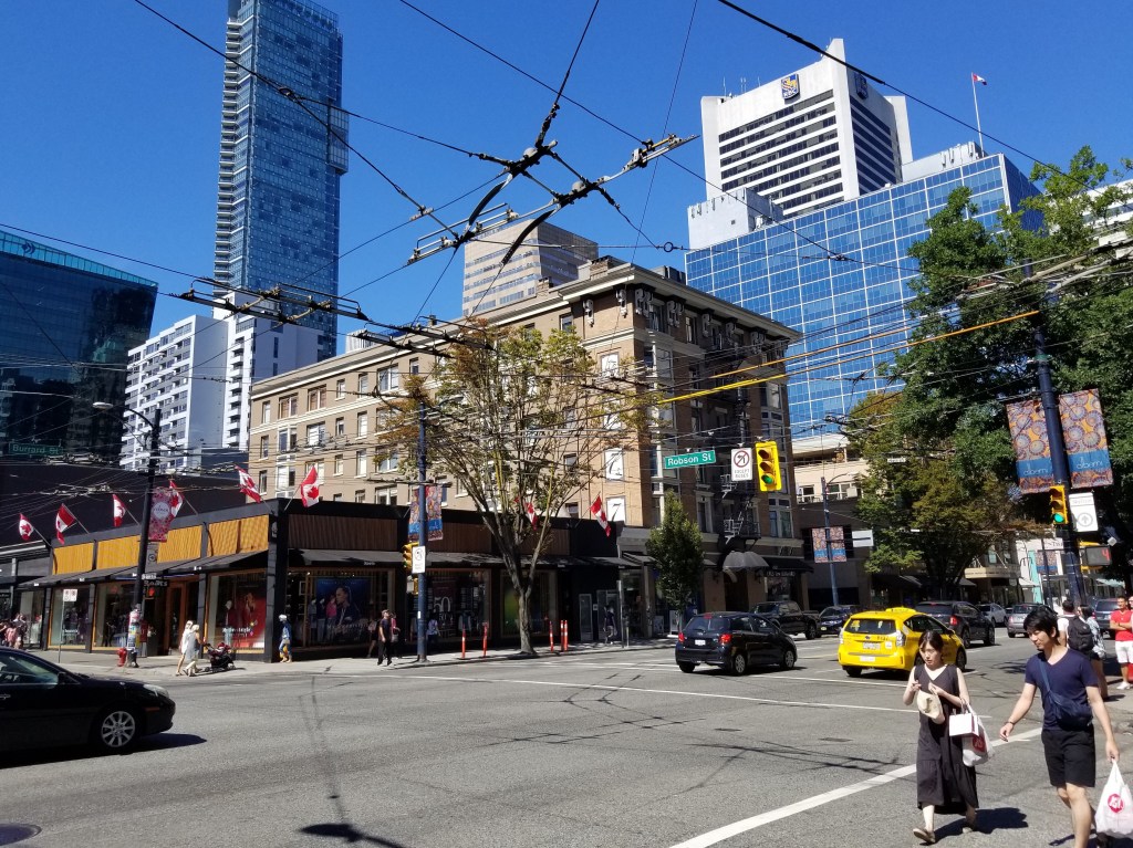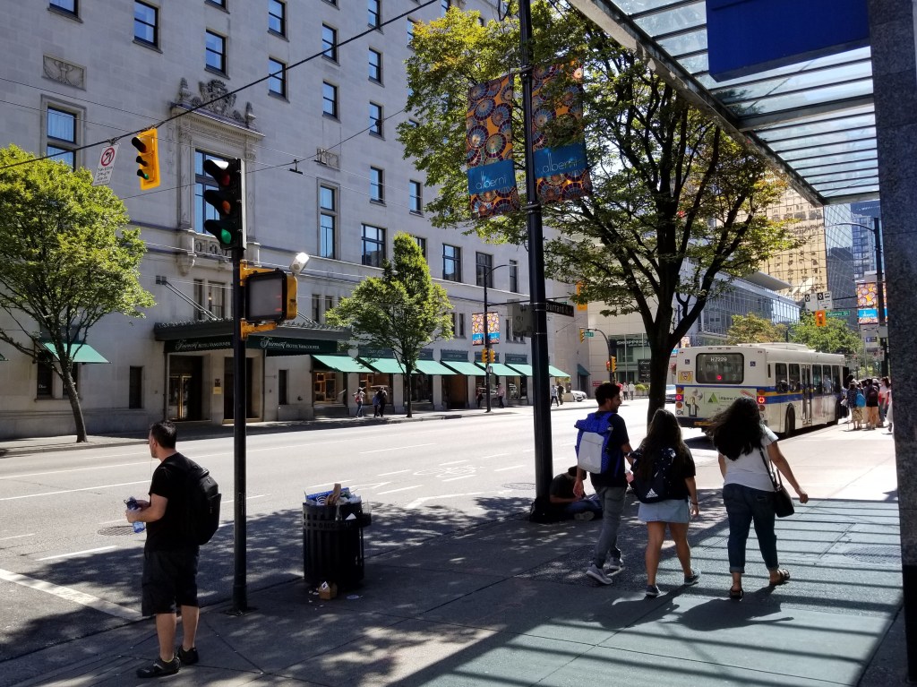 Burrard Street is served by SkyTrain’s Burrard Station, located underground between the intersections with Melville and Dunsmuir Streets in the heart of the Financial District. Along the downtown portion, there is a bike lane on the southwest-bound direction towards the Burrard Bridge.
