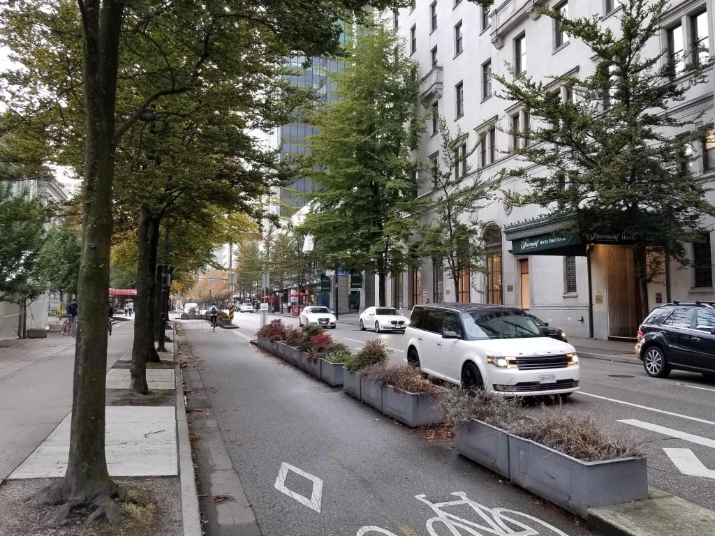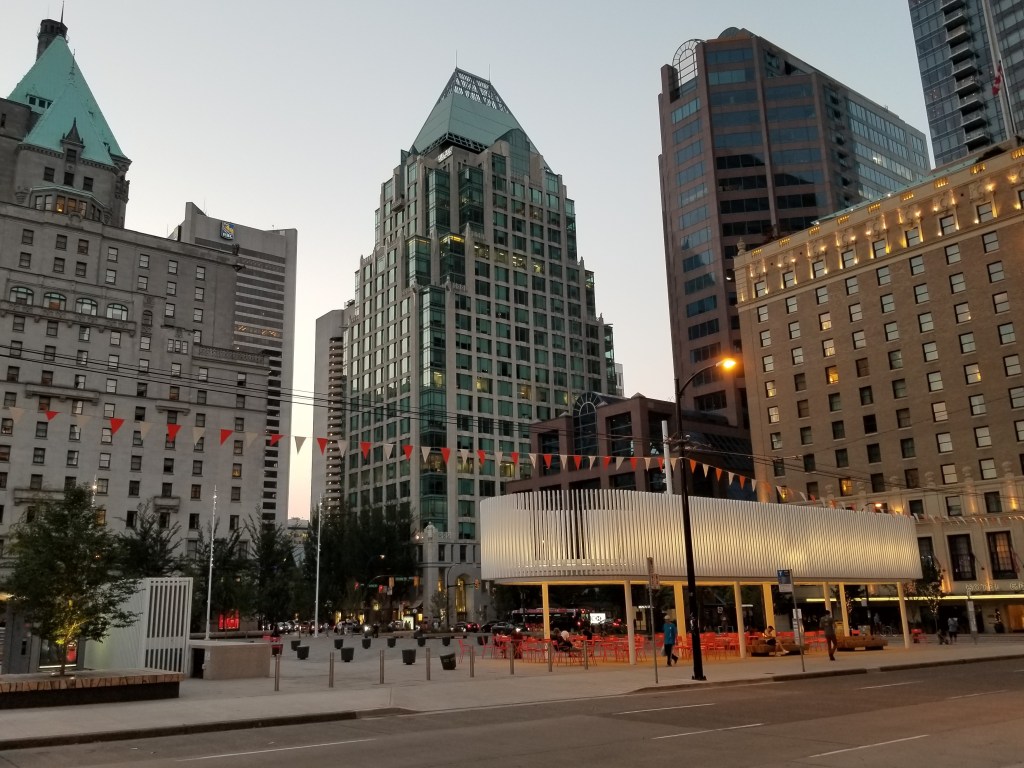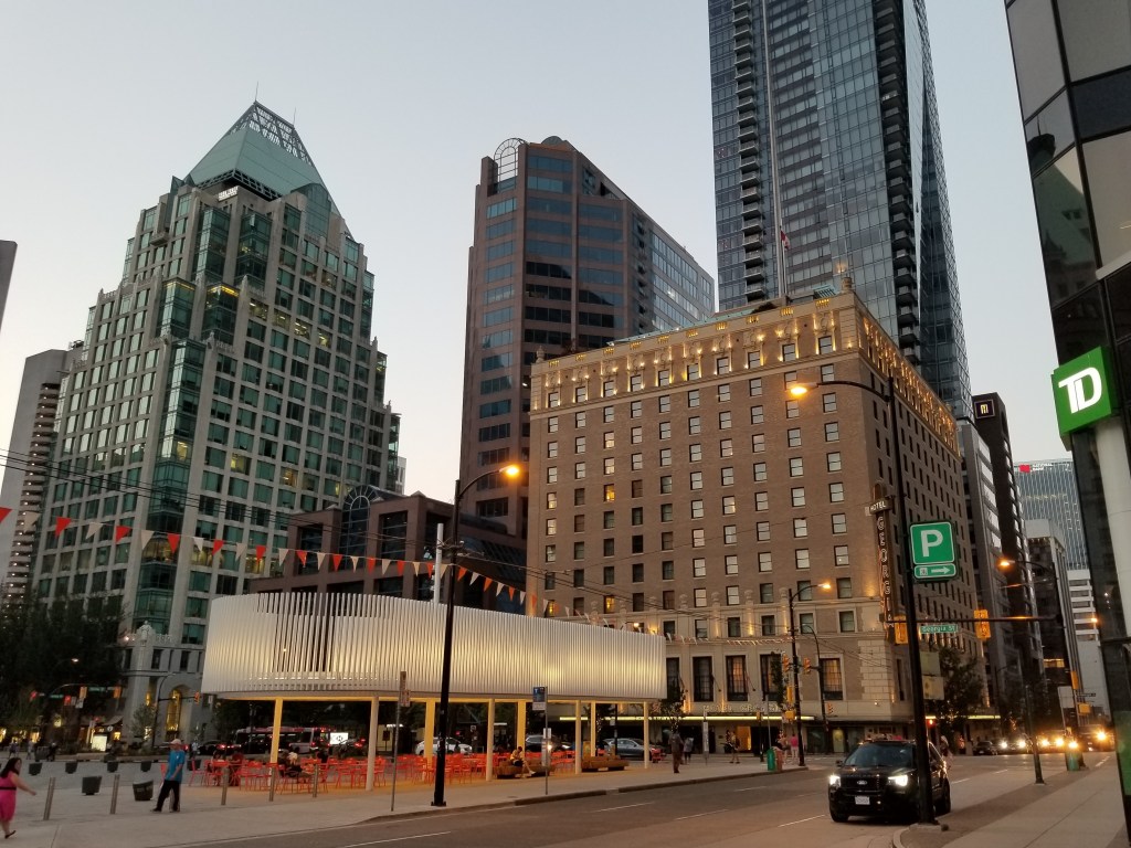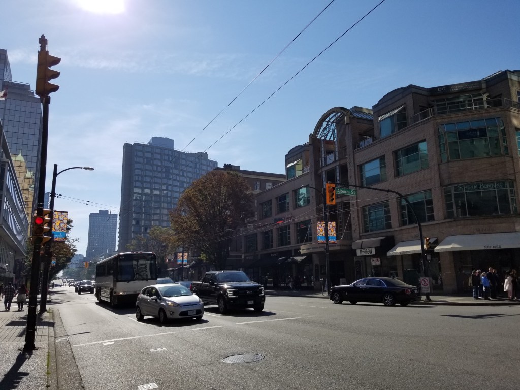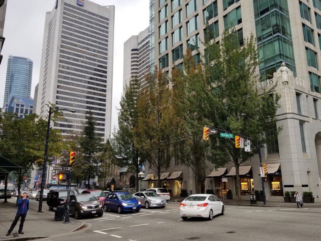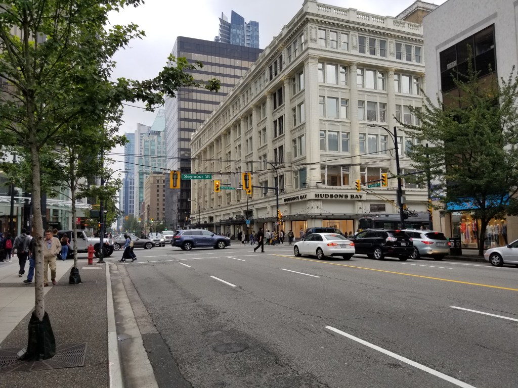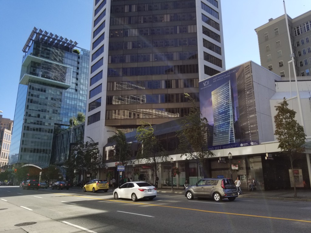Starting from its western terminus at Chilco Street by the edge of Stanley Park, Georgia Street runs southeast, separating the West End from the Coal Harbour neighbourhood. It then runs through the Financial District; landmarks and major skyscrapers along the way include Living Shangri-La (the city’s tallest building), Trump International Hotel and Tower, Royal Centre, 666 Burrard tower, Hotel Vancouver and upscale shops, the HSBC Canada Building, the Vancouver Art Gallery, Georgia Hotel, Four Seasons Hotel, Pacific Centre, the Granville Entertainment District, Scotia Tower, and the Canada Post headquarters. The eastern portion of West Georgia features the Theatre District (including Queen Elizabeth Theatre and the Centre in Vancouver for the Performing Arts), Library Square (the central branch of the Vancouver Public Library), Rogers Arena, and BC Place. West Georgia’s centre lane between Pender Street and Stanley Park is used as a counterflow lane.