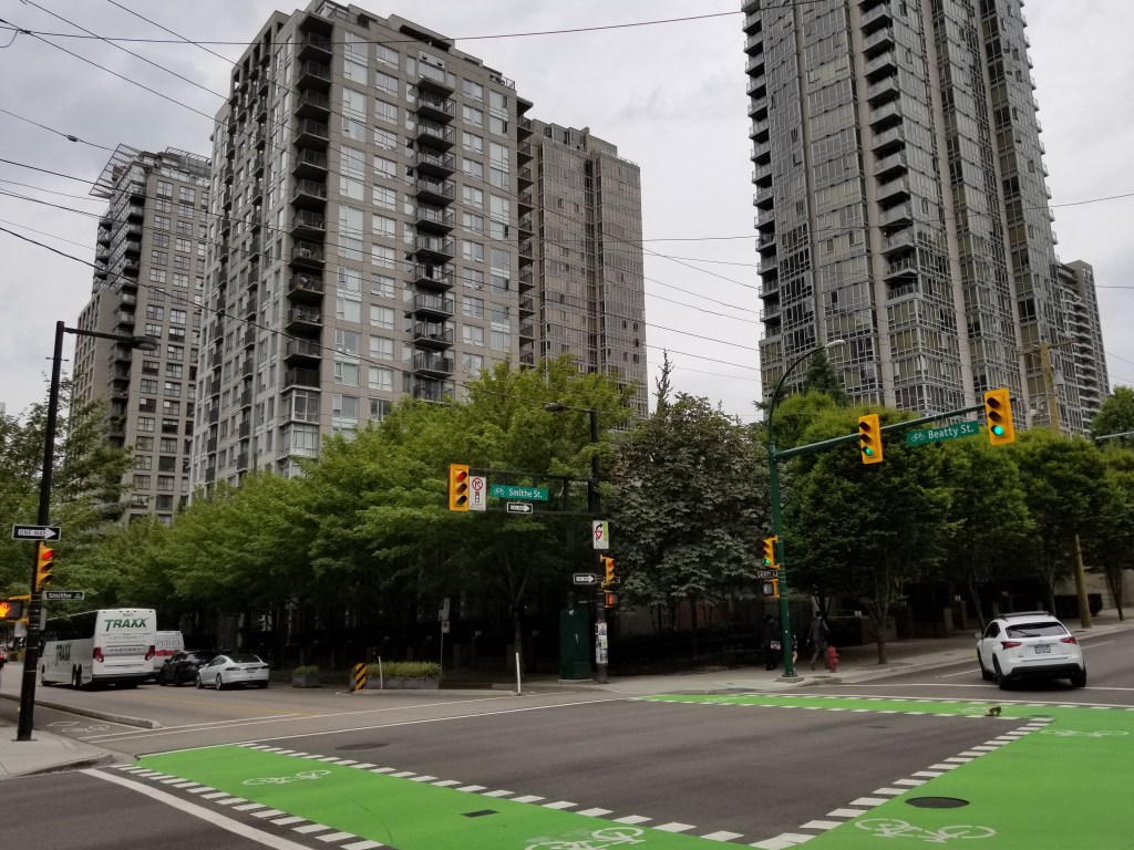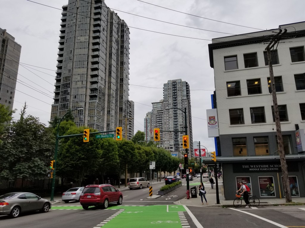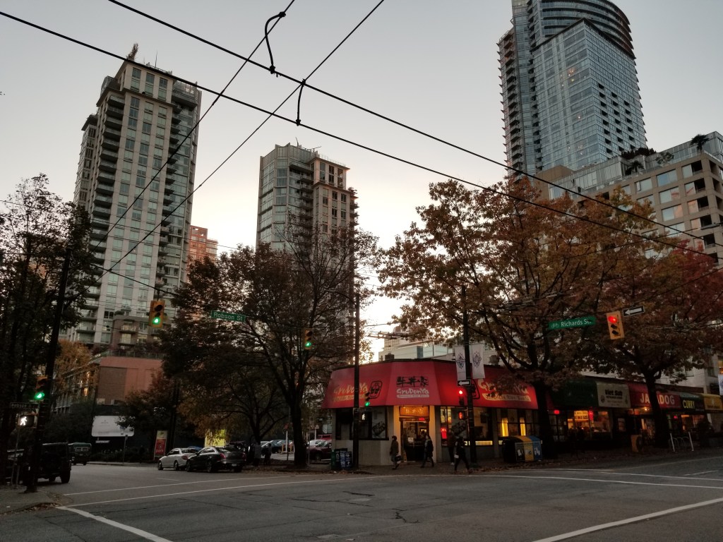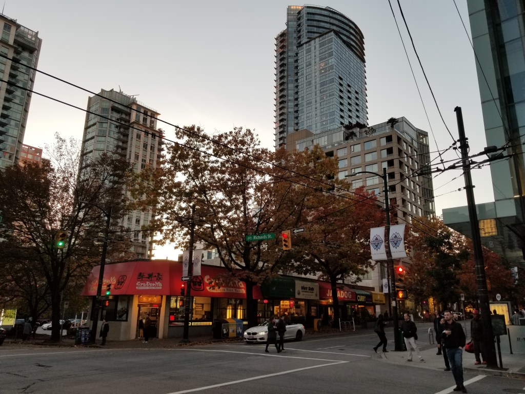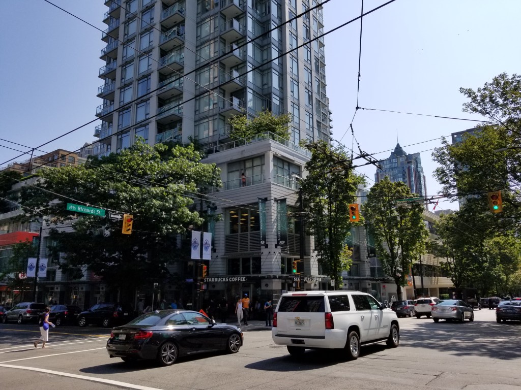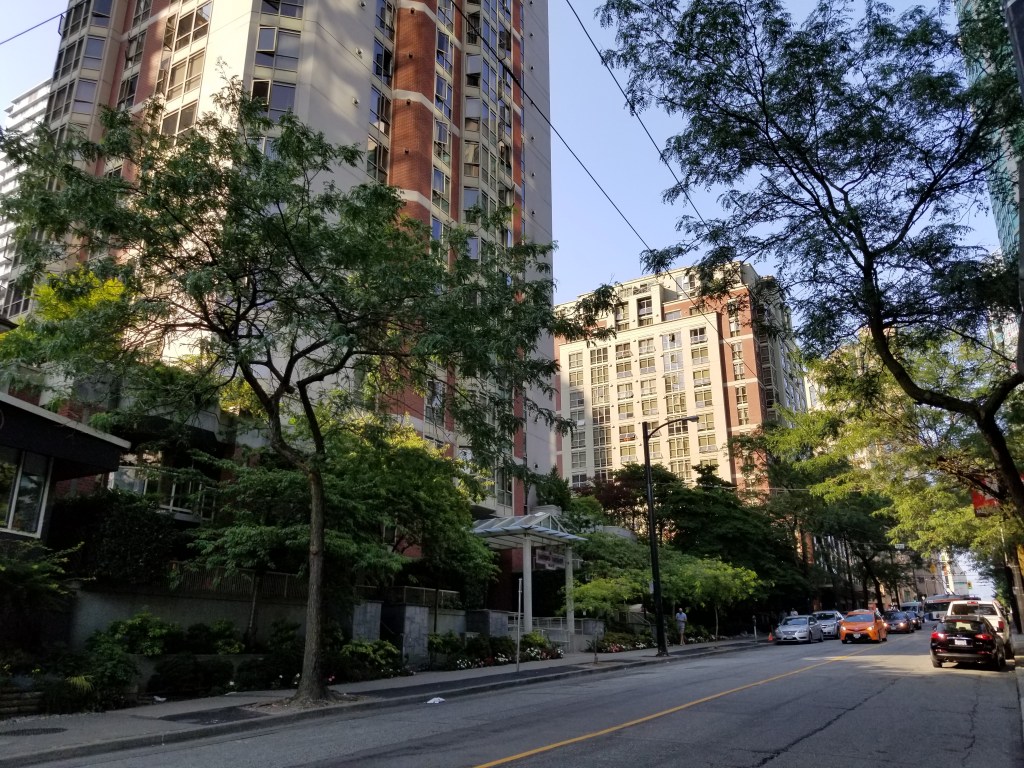 In 1895, train tracks were laid down the street, supporting a concentration of shops and restaurants. From the early to middle-late 20th century, and especially after significant immigration from postwar Germany, the northwest end of Robson Street was known as a centre of German culture and commerce in Vancouver, earning the nickname Robsonstrasse, even among non-Germans (this name lives on in the Robsonstrasse Hotel on the street). At one time, the city had placed streetsigns reading “Robsonstrasse” though these were placed after the German presence in the area had largely vanished.