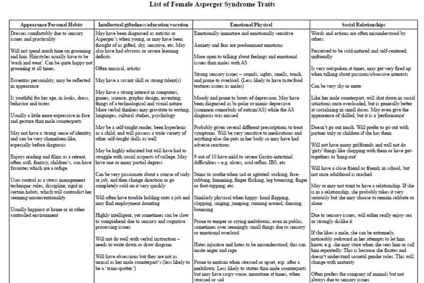 Since it has been more than a month since I found out that I have autism, I think that it’s time for an update. I have a better understanding of my autism now. I’ve already read dozens of articles about autism and about autistic people, and I’ve had some time to observe and to think about my autistic traits. In about three or four weeks, I learned just about everything that I needed to know about autism, and, to be honest, autism turned out to be one of the most interesting topics that I’ve read about in the last few years. It’s really amazing in how many peculiar ways autistic people are different from normal people. I’ve included a chart that I stumbled upon on the internet in this post that lists the Asperger syndrome traits of females. There wasn’t a chart for males, but I can say that males have many of the same traits. In addition, I’ve been posting articles about autism on my blog that I found to be of most use to me. It’s clear to me now that the condition that I have is the so-called Asperger syndrome. Apparently, it’s a mild form of autism. People with more severe autism usually have slightly deformed facial features and crooked teeth. Some of them can’t even speak, and their intelligence is below normal. But Asperger syndrome is the form of autism that produces autistic geniuses. So, the reason why I have the looks of a normal person is because I have Asperger syndrome. I think that I don’t even have the odd look in my eyes that some people with Asperger syndrome have. So, the big reason why I haven’t been diagnosed with autism and why no one has told me that I have autism is because I have normal looks and because my autism isn’t severe. I also haven’t been involved in anything weird. Moreover, if I make enough effort, I can usually act like a normal person. This is something that I don’t even have to think about because I’ve always been doing this. I have developed a relaxed way of moving, walking, and of doing things, to the extent that I’ve been told by a few people at work that I’m relaxed while they’re nervous. But life isn’t a cakewalk for people with Asperger syndrome. It’s still difficult. From what I’ve read about autism, I found out that even a large percentage of people with Asperger syndrome end up unemployed, homeless, dead, or in prison after they become adults. Most people with Asperger syndrome seem to have average lives. But a large percentage still become famous or get recognized as so-called geniuses or savants. According to some researchers, a much larger percentage of people in the autistic population become geniuses than in the normal population. Autism isn’t at all common. Only about 1% of people are autistic, and only about 0.5% of people have Asperger syndrome. This means that there are at least a few thousand intelligent autistics in every big city, but most of them don’t know that they’re autistic. As far as I know, I was the only autistic person at the elementary school and at the high school that I attended. If there were other autistics there at the same time, I didn’t know about them. There’s a large amount of useful information about autism on the internet. I didn’t even have to look for a good book about autism because of this. There’s also not a shortage of lists on the internet that list famous living or dead people that are believed to have had autism. Some of the names that are usually mentioned on such lists are Hans Christian Andersen, Lewis Carroll, Wolfgang Amadeus Mozart, Ludwig Wittgenstein, Michelangelo, Stanley Kubrick, Nikola Tesla, Albert Einstein, Bill Gates, Emily Dickinson, Michael Jackson, Steve Jobs, Mark Zuckerberg, Ludwig van Beethoven, Vincent van Gogh, and, um, Jesus Christ. Some people think that state leaders like Napoleon Bonaparte, Adolf Hitler, Catherine the Great, and Thomas Jefferson were autistics. Well, knowing what I know about myself and about other autistics, I think that this is certainly possible. All of this information is new to me, however. Before July of this year, I didn’t know anything about autism, and I didn’t know that I’m autistic. I mean, last year, I read Mark Haddon’s book ‘The Curious Incident of the Dog in the Night-Time’ (2003), which is about an autistic person, and I still didn’t find out anything about autism. A girlfriend of mine sort of recommended this book to me, and I finally got around to reading it in 2022. I would say that things would have been better for me if I had known that I’m autistic as early as possible. I would have known how to better adapt my behavior, why I have trouble socializing, where I should channel my energies, and where some of my most important problems are coming from. Like most other people with autism, I was bullied a lot when I was growing up. There were even times when teachers mocked or insulted me. Well, my own parents often ridiculed, mocked, or insulted me when I was growing up, and they made me do things that I didn’t want to do, even when I was having meltdowns. The story is the same for many other autistics. In the modern West, the experiences of autistic females are somewhat different from the experiences of autistic males when they’re growing up. Since autistic females are somewhat better at socializing and communicating than autistic males, they tend to get involved in some subculture, usually the goth subculture, when they’re in high school, and they engage in some in and out action with one or more dudes in that subculture before they graduate from high school. But they still often feel depressed, and they tend to develop one or more insecurities. Autistic males, on the other hand, tend spend a lot of their time on reading or doing something with things like computers. They tend not to get depressed. Obviously, it’s not as easy for them to get in bed with someone as it is for autistic females, and many autistic males continue to live with their parents after t